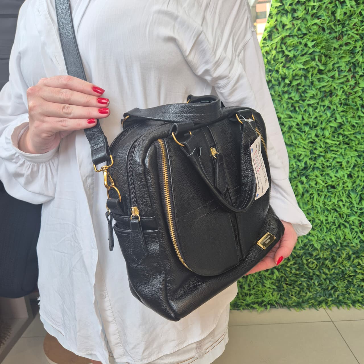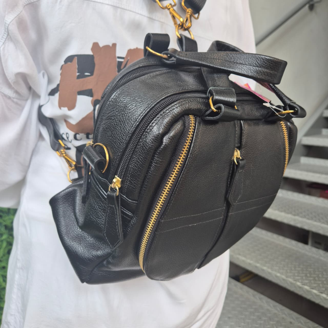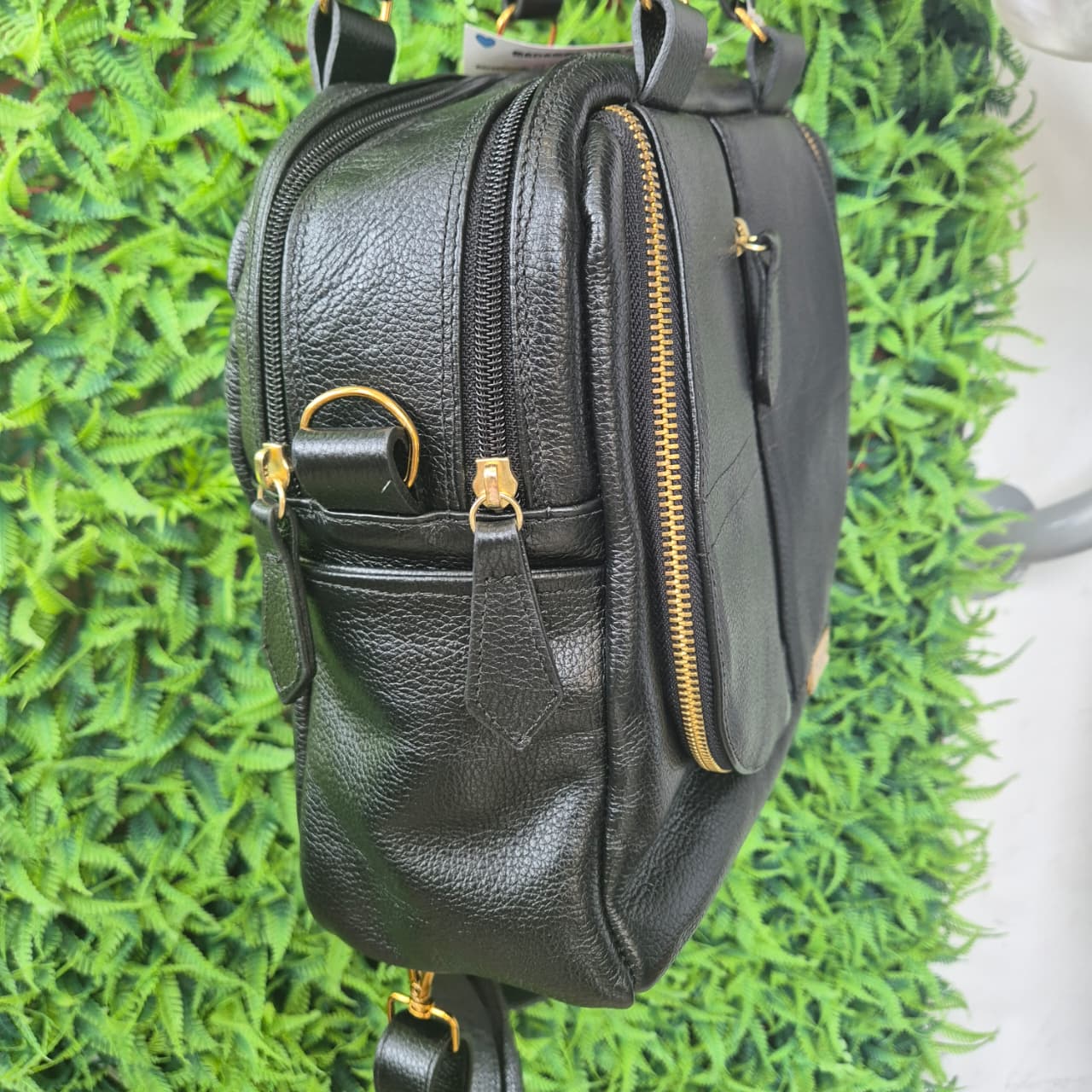 Feita em couro legítimo de toque macio e acabamento premium, possui zíperes dourados, compartimentos amplos e alças ajustáveis que unem conforto e estilo.