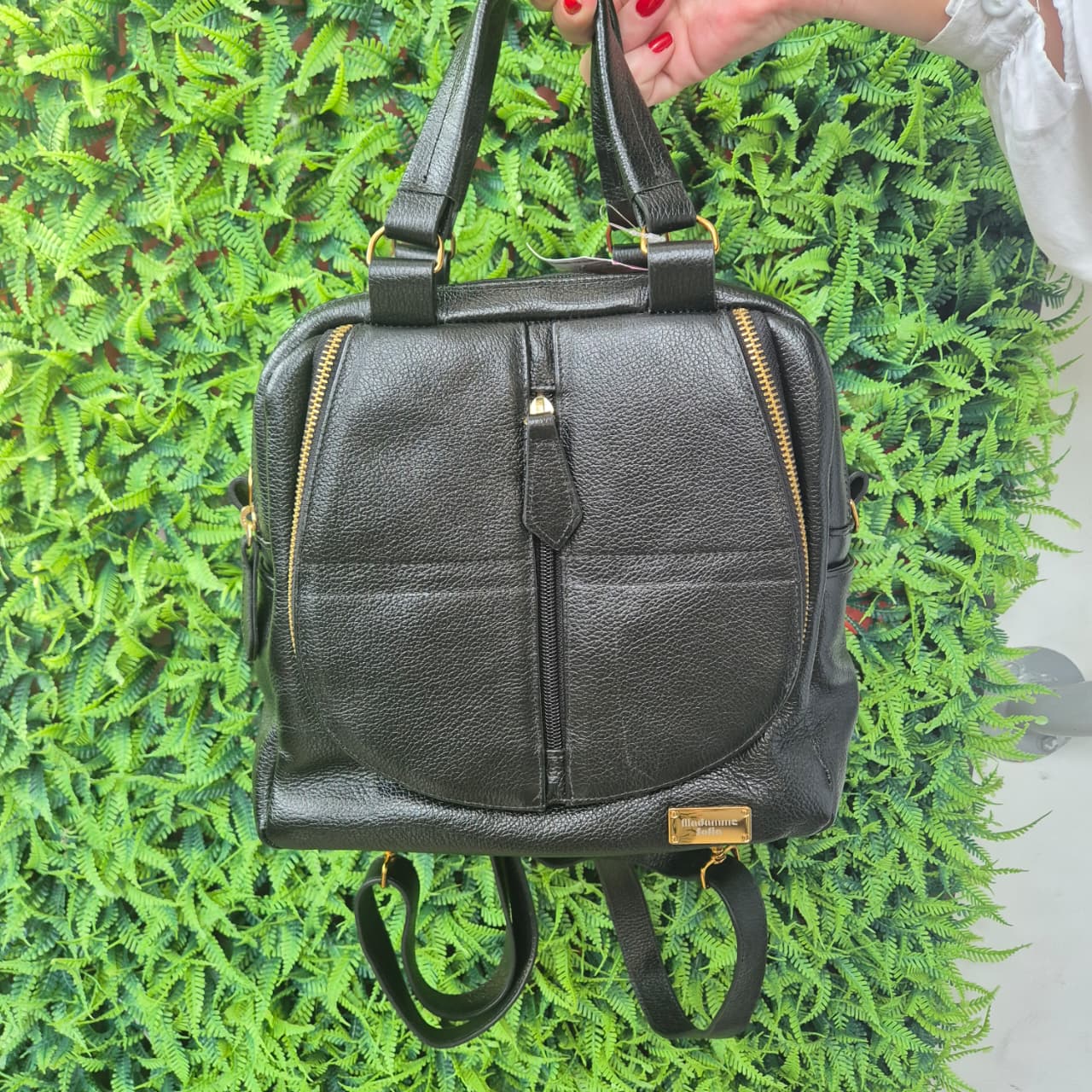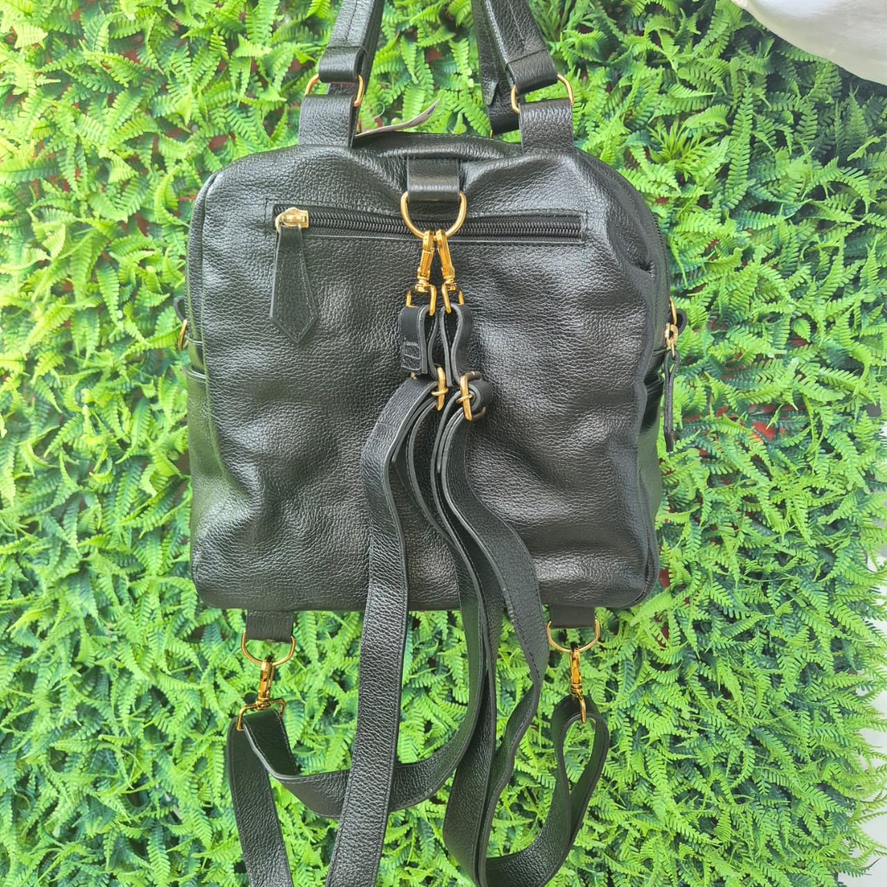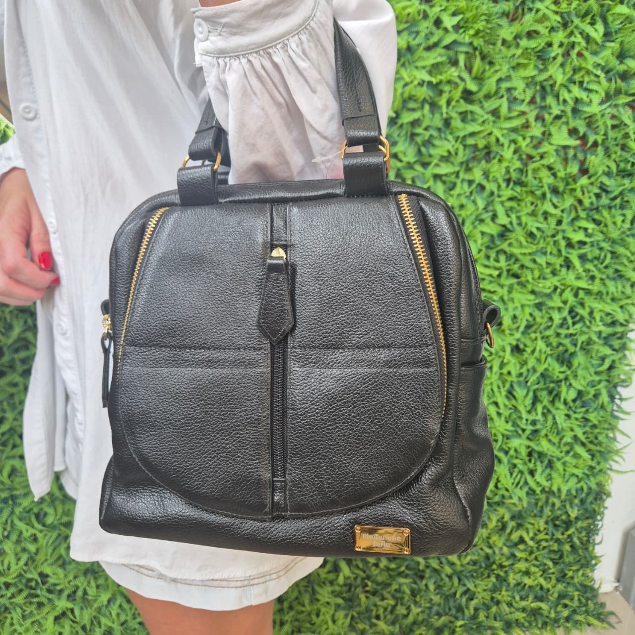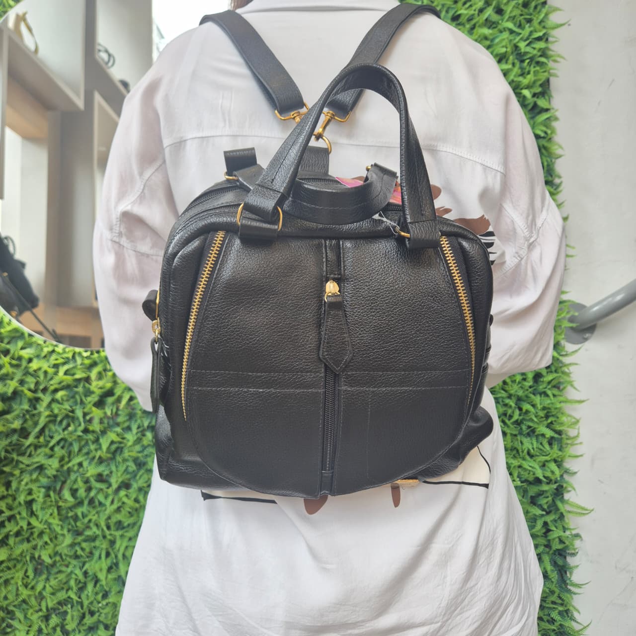 Feita em couro legítimo de toque macio e acabamento premium, possui zíperes dourados, compartimentos amplos e alças ajustáveis que unem conforto e estilo.