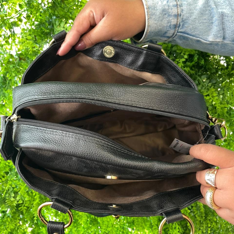 Seu design clássico e atemporal traz duas opções de alça — de mão e transversal ajustável — garantindo praticidade e conforto no uso diário.