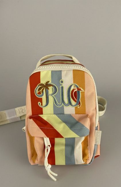 Esta é a Mini Mochila Farm Retrô RJ, o acessório perfeito para quem busca unir a nostalgia do design vintage com a praticidade urbana. Com uma padronagem de listras verticais em tons solares de terracota, amarelo, azul e off-white, ela destaca um bordado frontal icônico com a escrita “Rio”, celebrando a alma carioca de forma estilosa e compacta. É a escolha ideal para carregar o essencial com as mãos livres, seja em um passeio pelo calçadão ou no agito do dia a dia.
