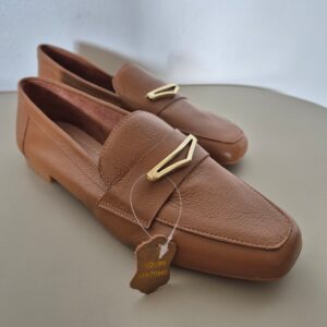 Mocassim bege em couro camurça, com design minimalista e detalhe metálico piramidal que garante sofisticação na medida certa. O modelo traz costura aparente elegante, sola confortável e tonalidade neutra, perfeita para acompanhar diferentes combinações.