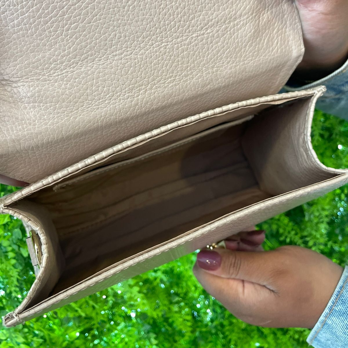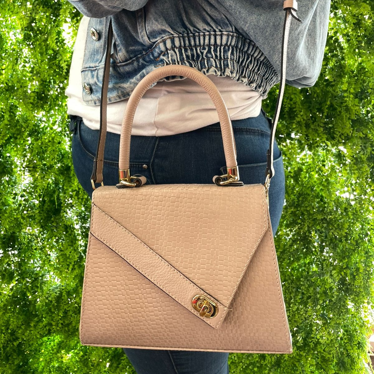 O destaque vai para o fechamento frontal com detalhe geométrico e os acabamentos em metal dourado, que garantem charme e exclusividade. Possui alça de mão reforçada e alça longa ajustável, oferecendo versatilidade no uso.