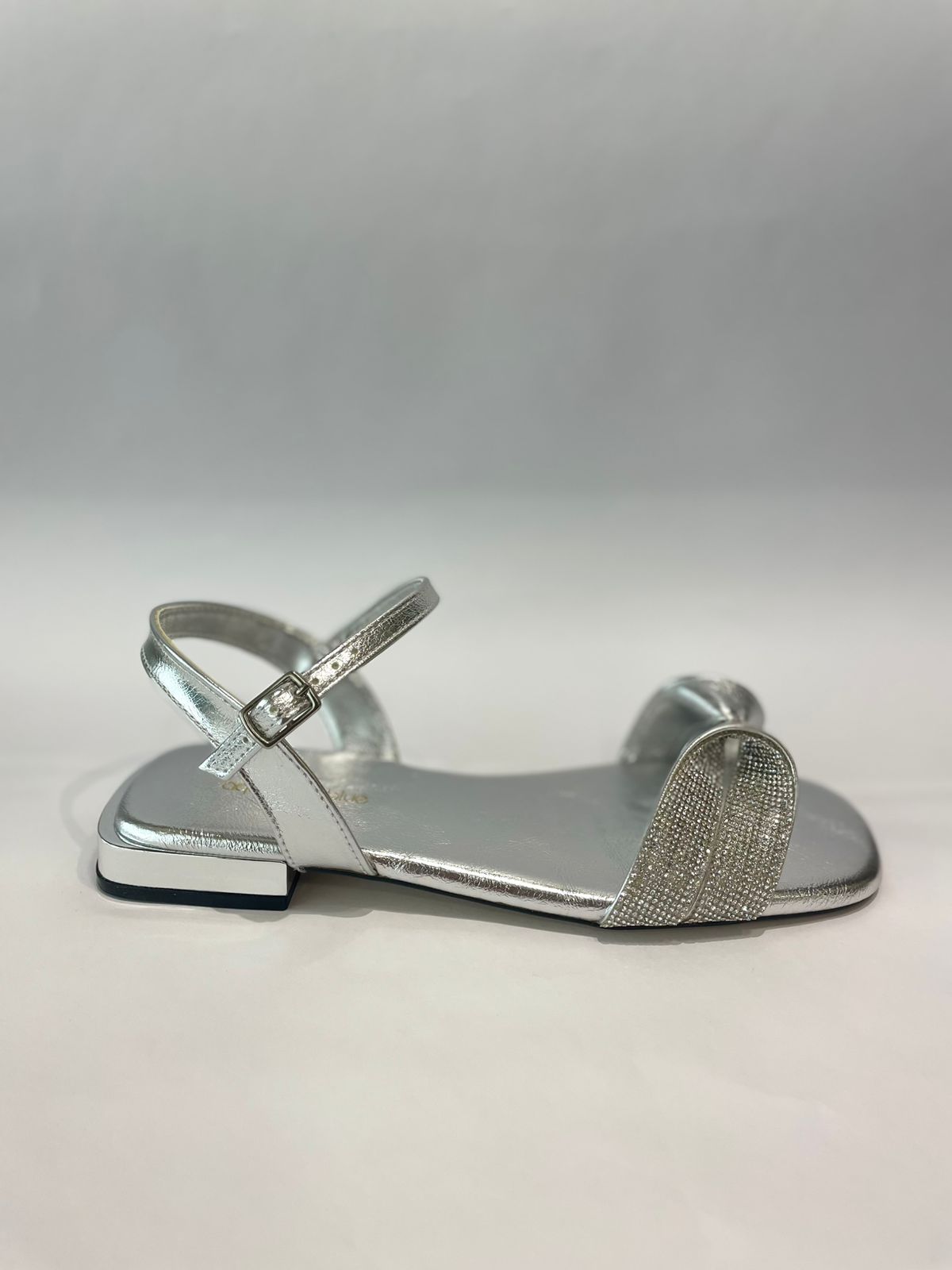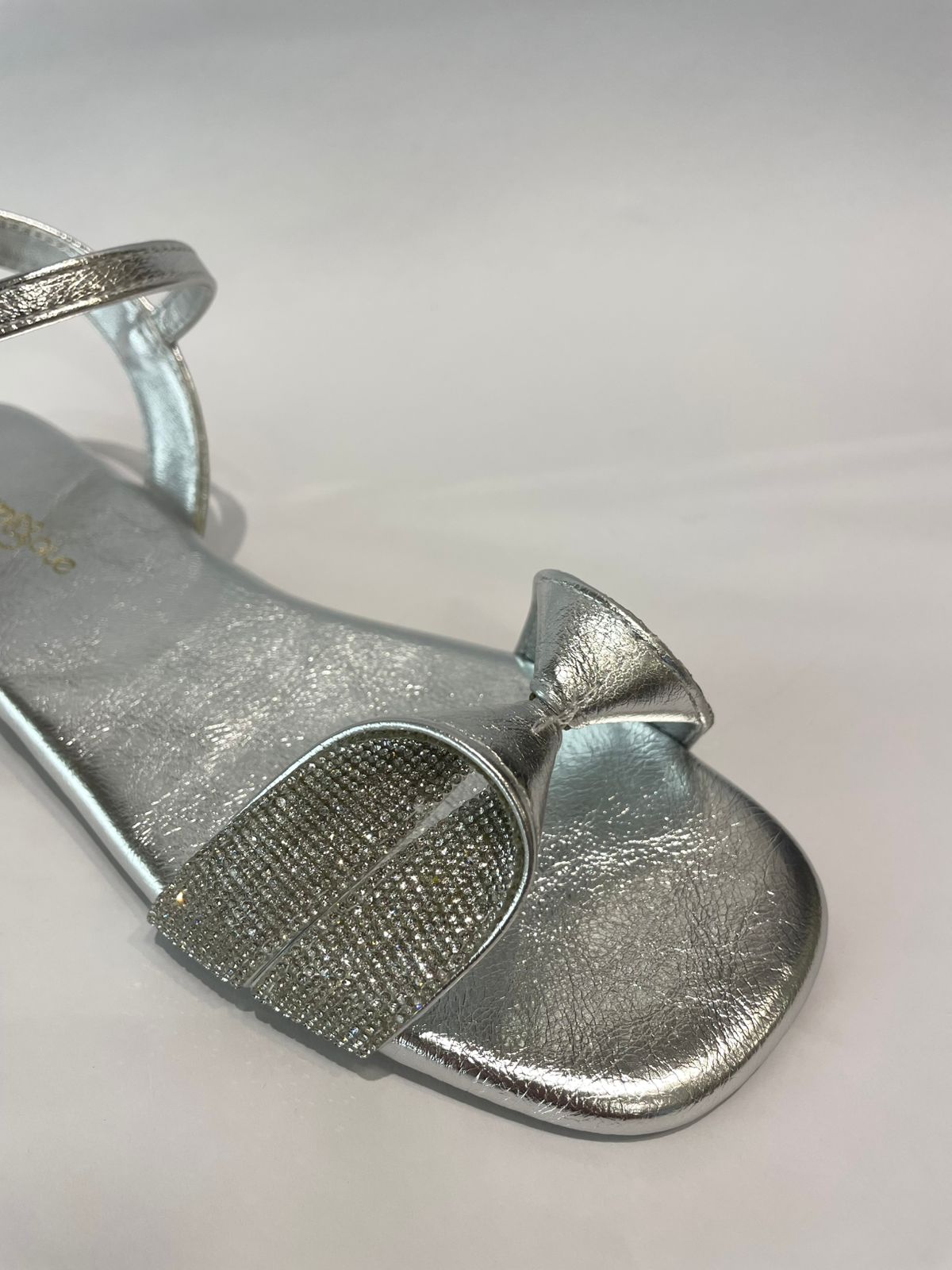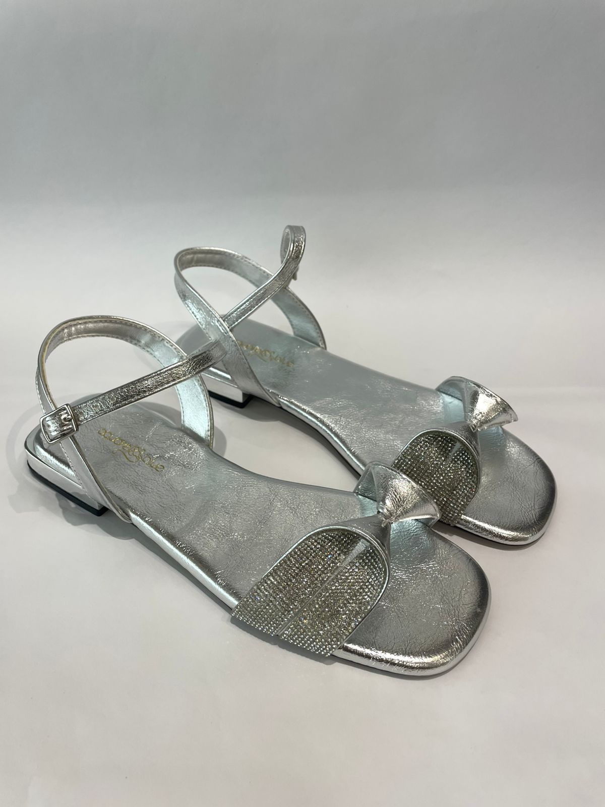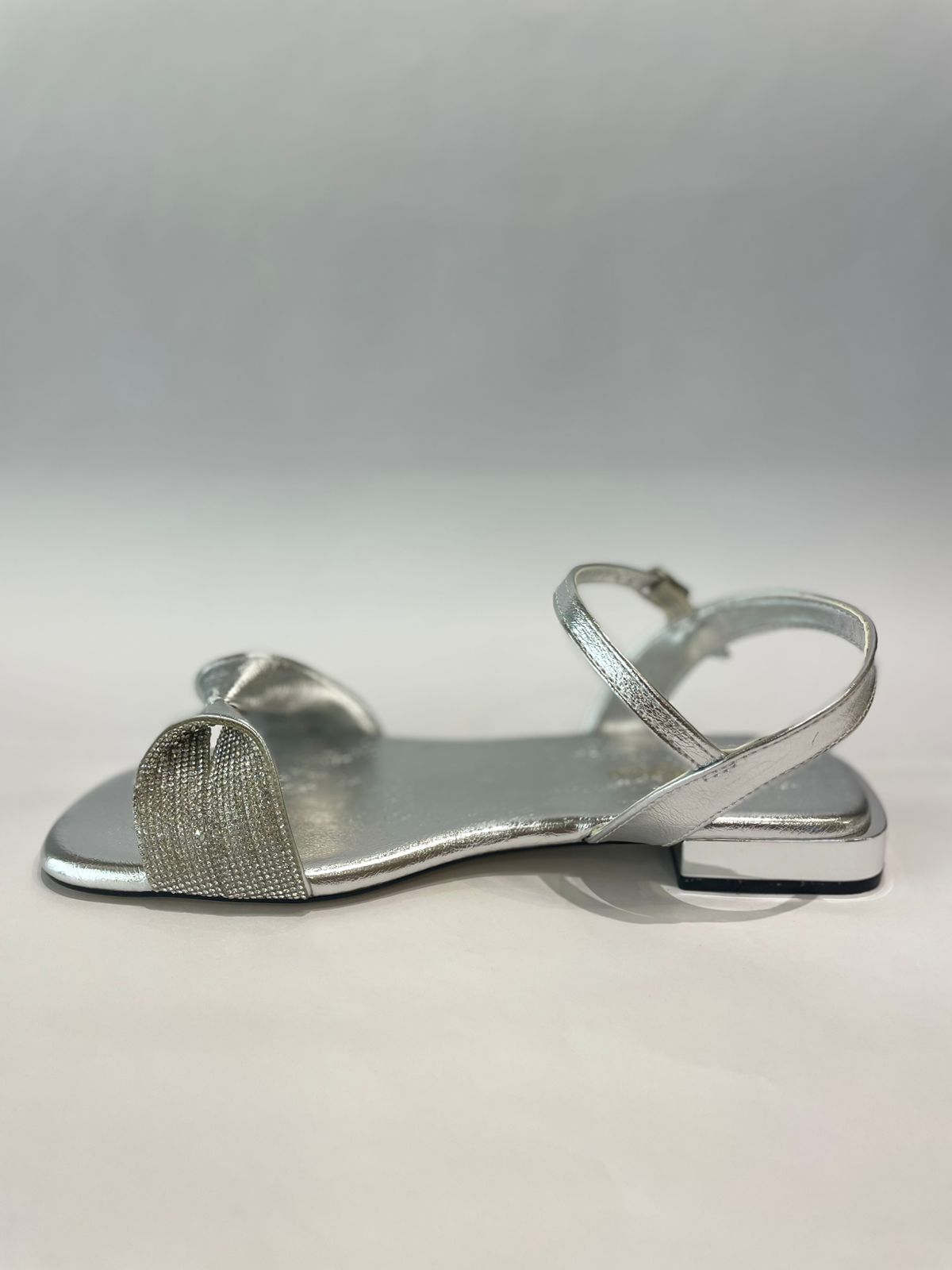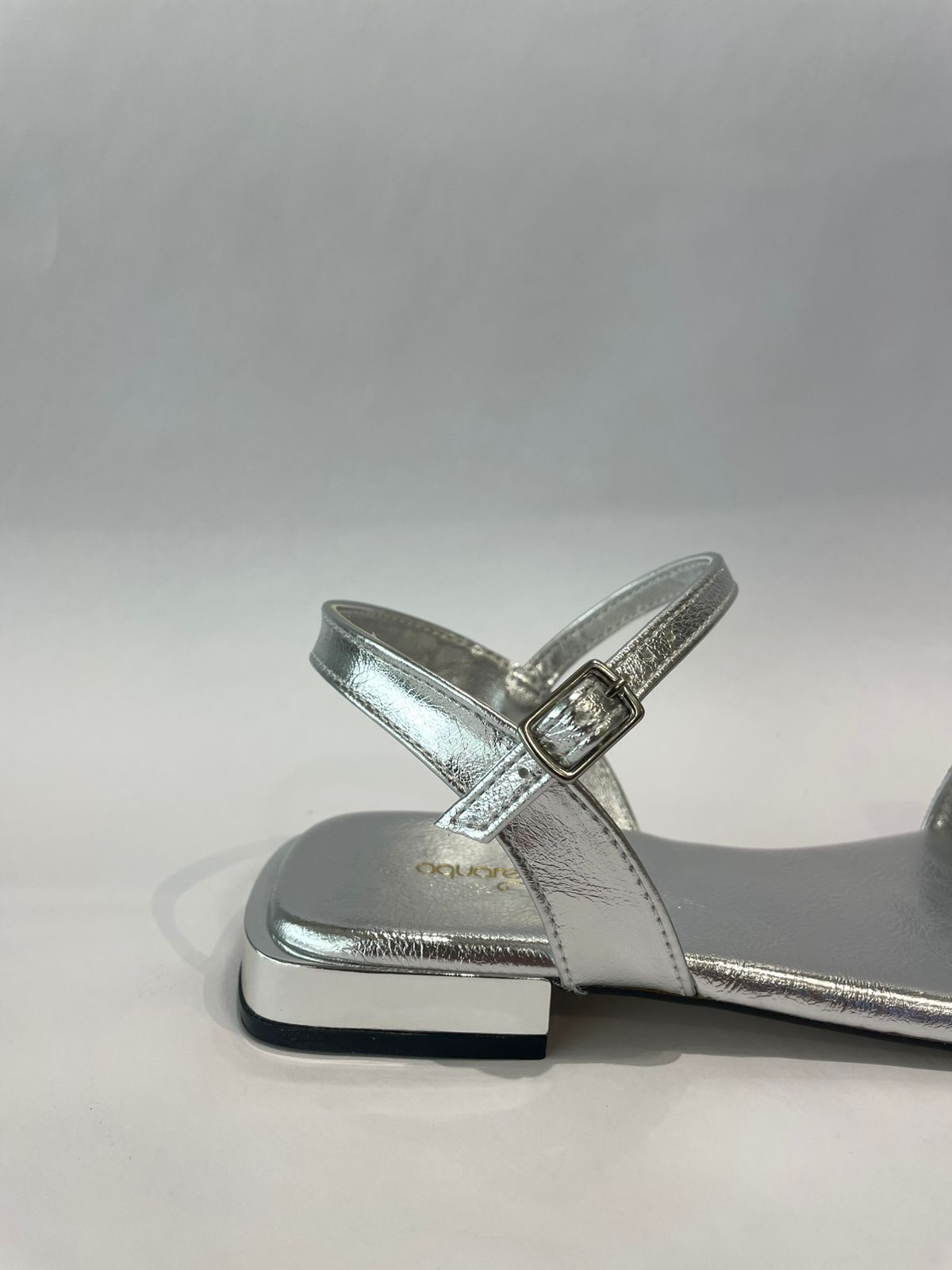 A sandália Aquarela prata encanta com seu brilho sutil e design minimalista, destacando o acabamento metalizado e o detalhe de pedrarias na tira frontal, que adiciona um toque de glamour na medida certa.