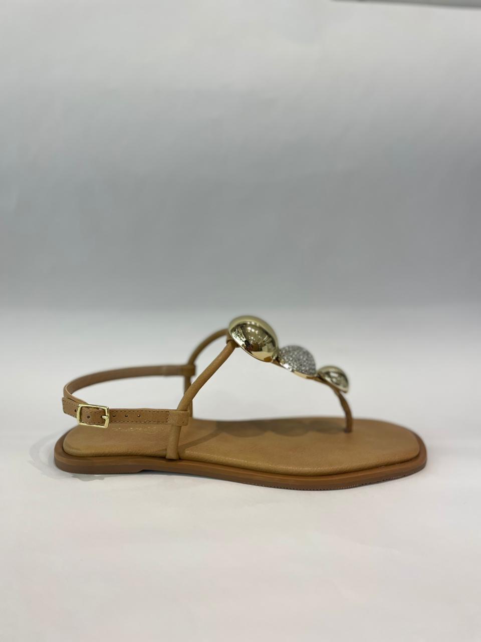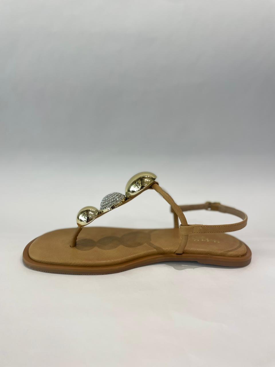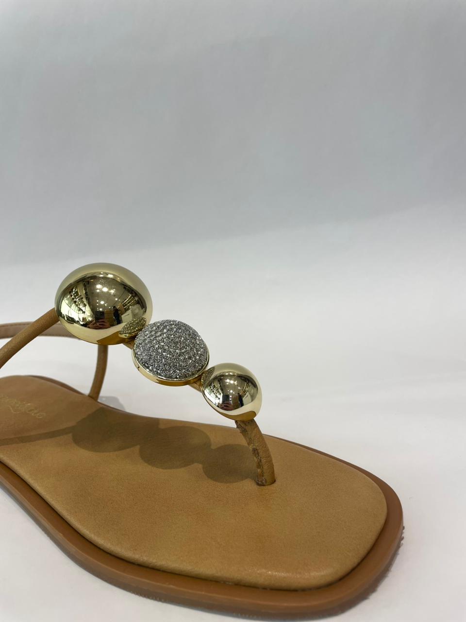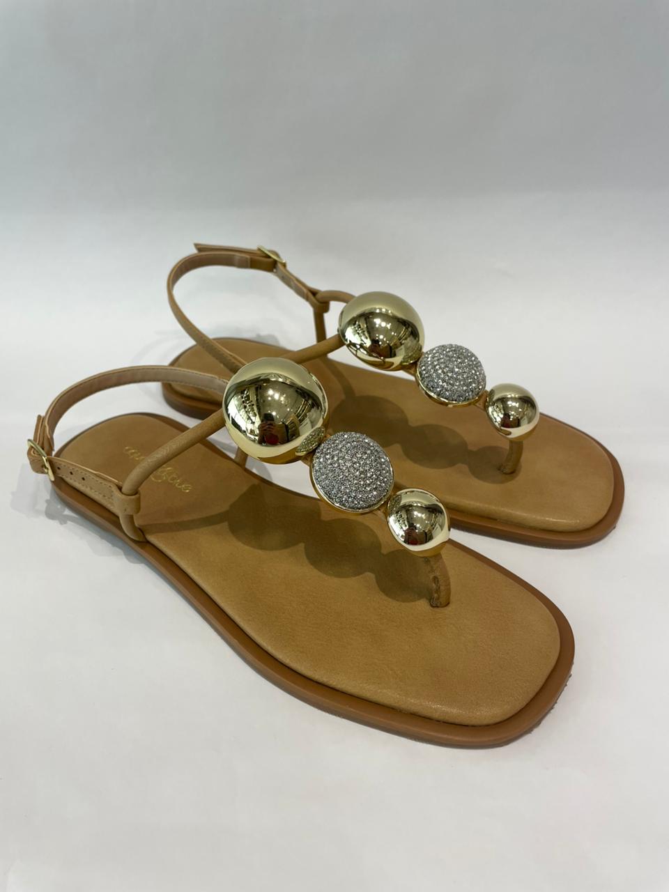 A sandália Aquarela combina o conforto da rasteira com o glamour das esferas metalizadas e aplicações de brilho, criando um visual sofisticado e moderno.