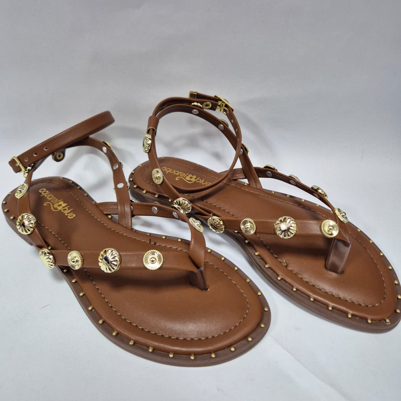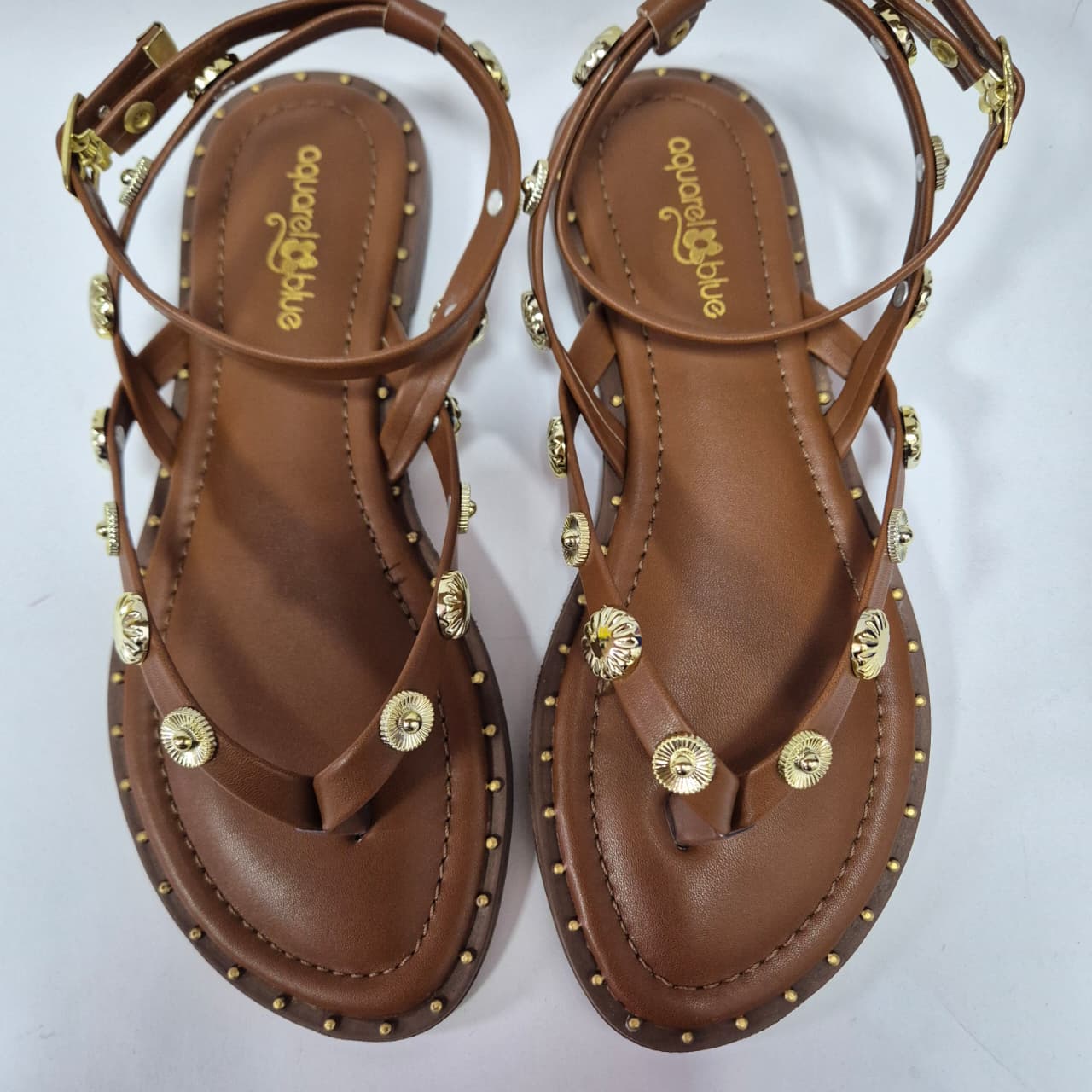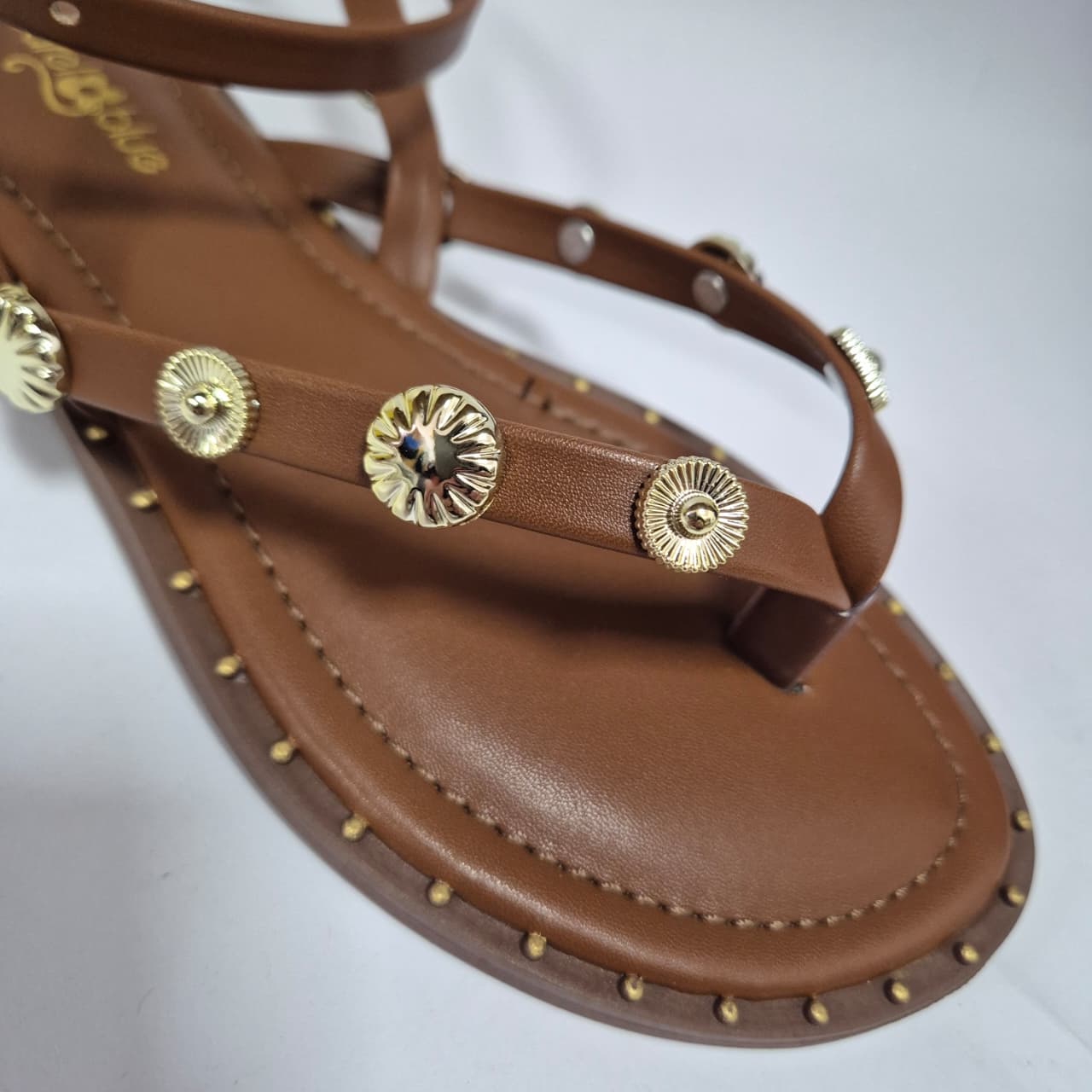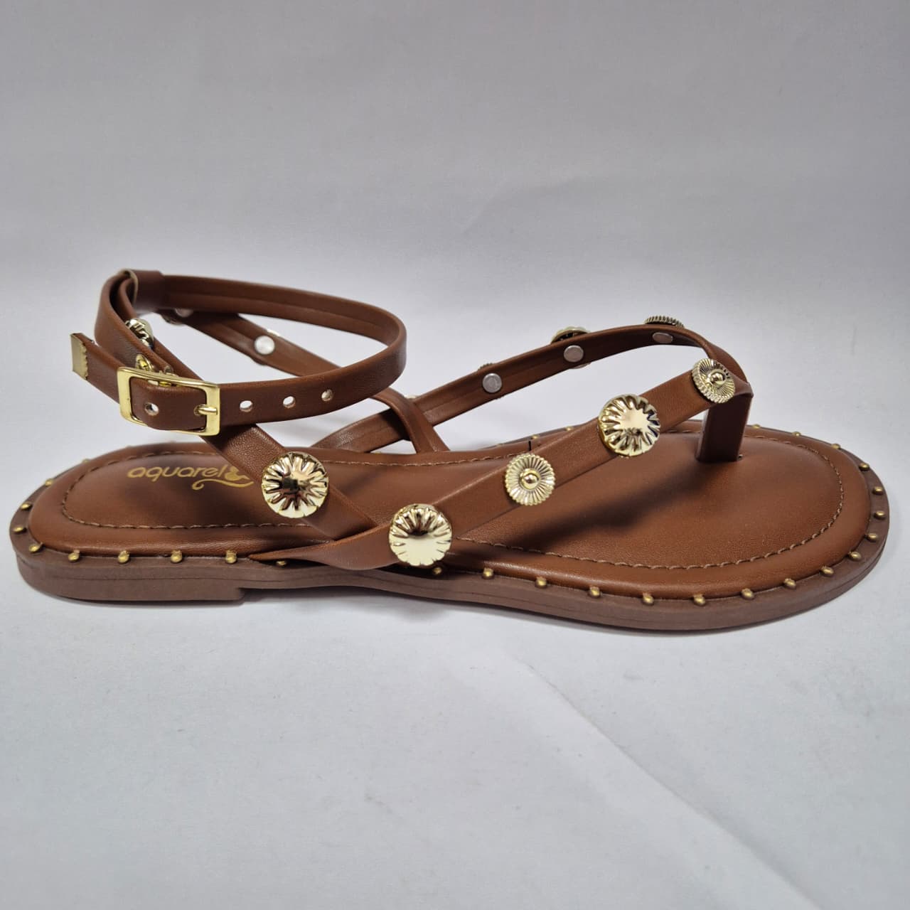 A rasteira Aquarela marrom é a escolha perfeita para quem valoriza estilo e conforto no dia a dia. Com tiras delicadas e aplicações metálicas em dourado, ela transforma qualquer look básico em uma produção cheia de personalidade.