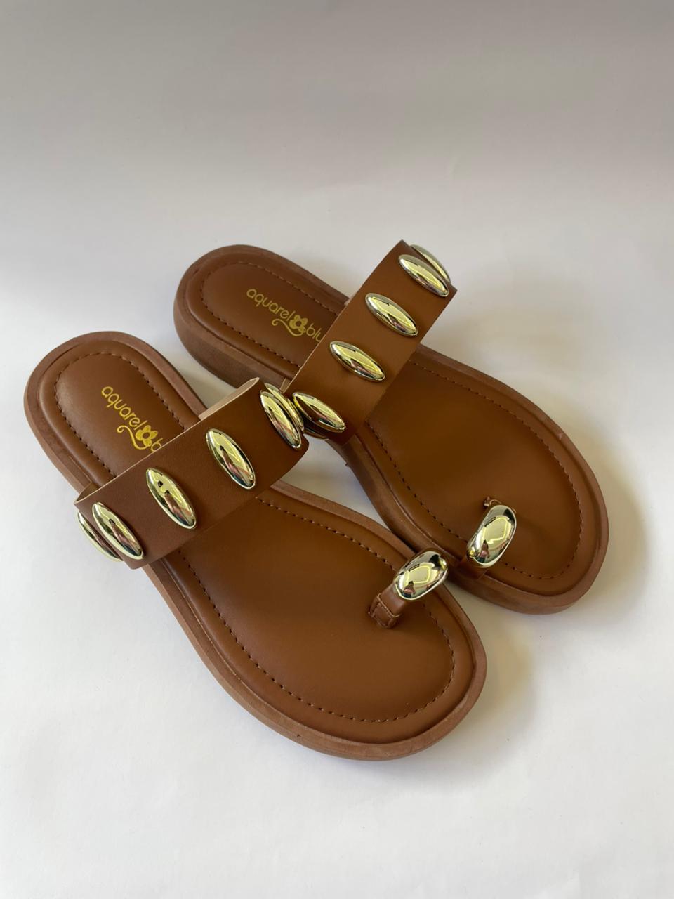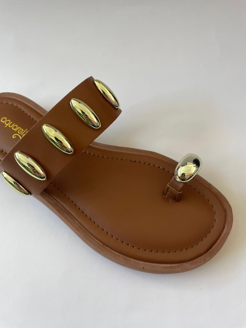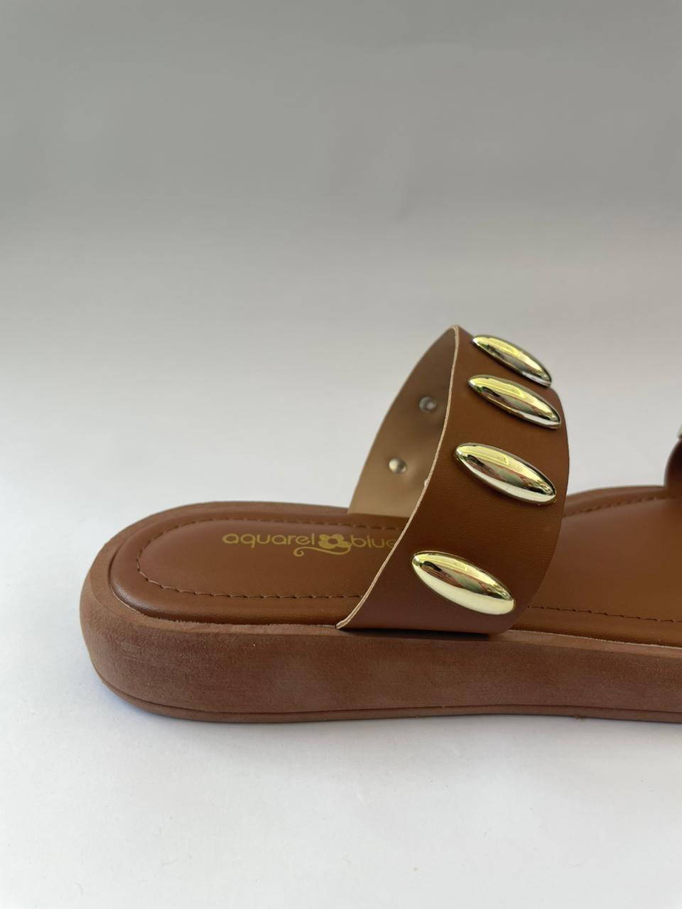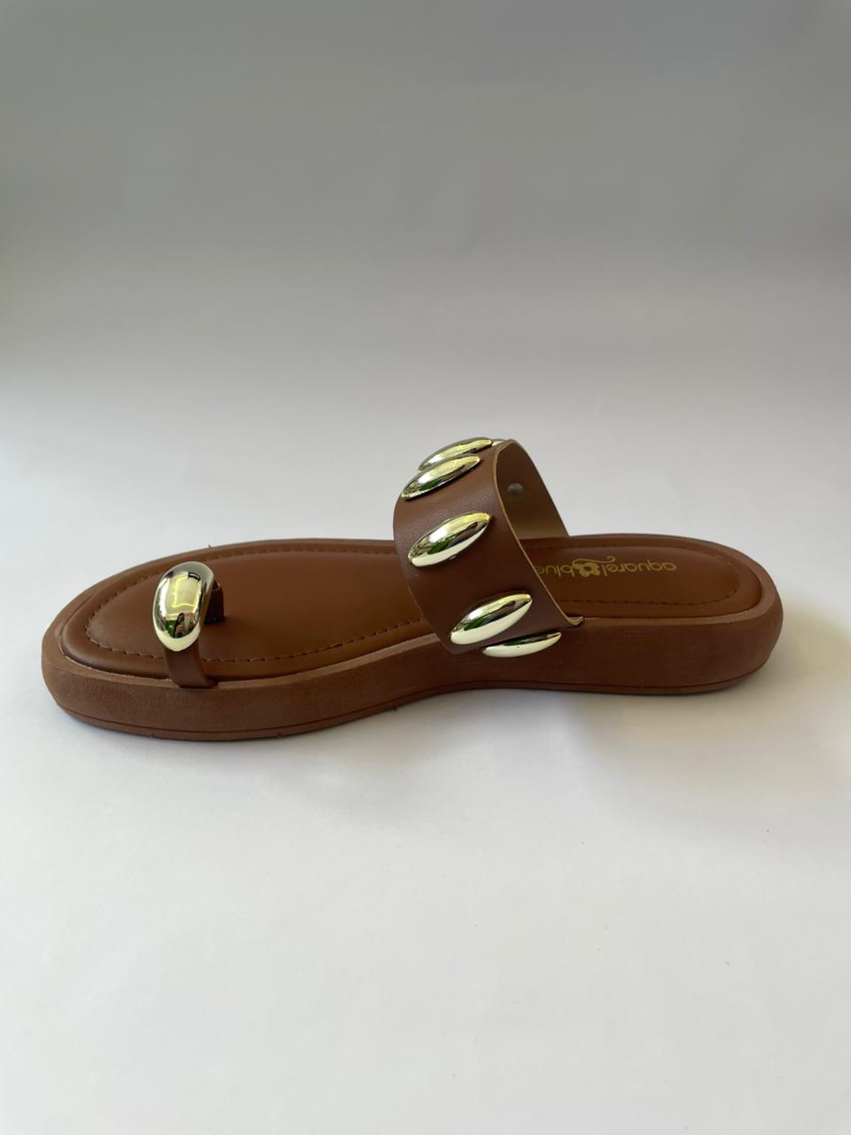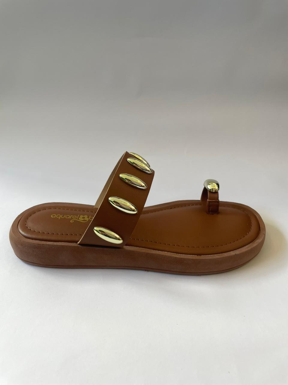 O charme artesanal e o toque moderno se encontram nesta rasteira Aquarela. Em tom caramelo elegante, o modelo traz aplicação de metais dourados que são puro destaque, um detalhe que transforma o básico em tendência. Perfeita para compor looks leves e sofisticados, essa sandália une conforto e estilo em cada movimento. Ideal para quem ama estar por dentro da moda sem abrir mão da autenticidade. ?
