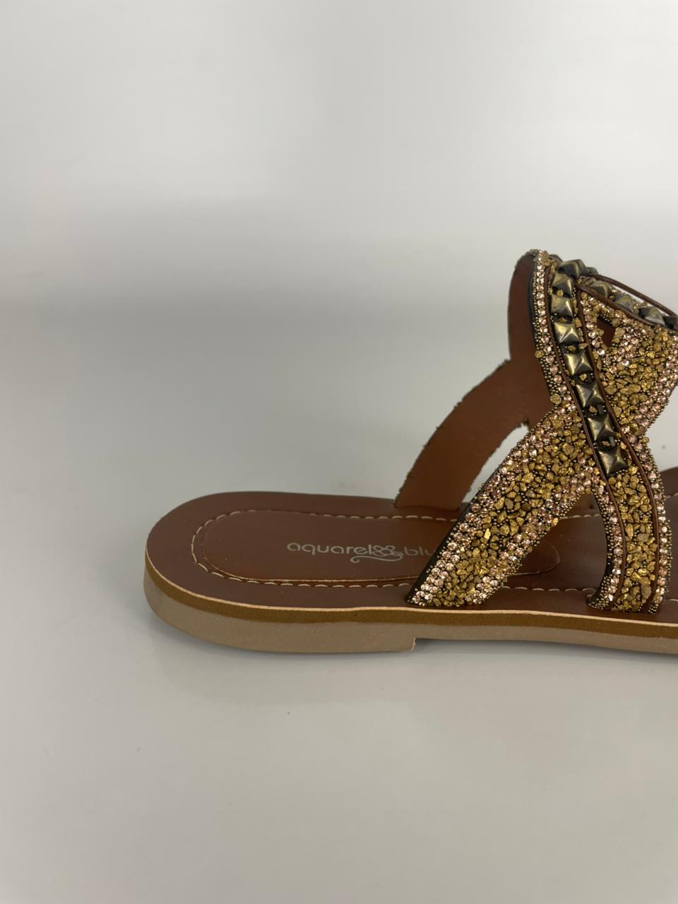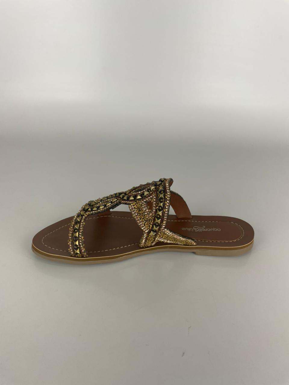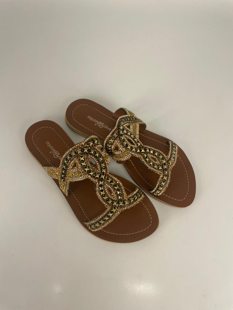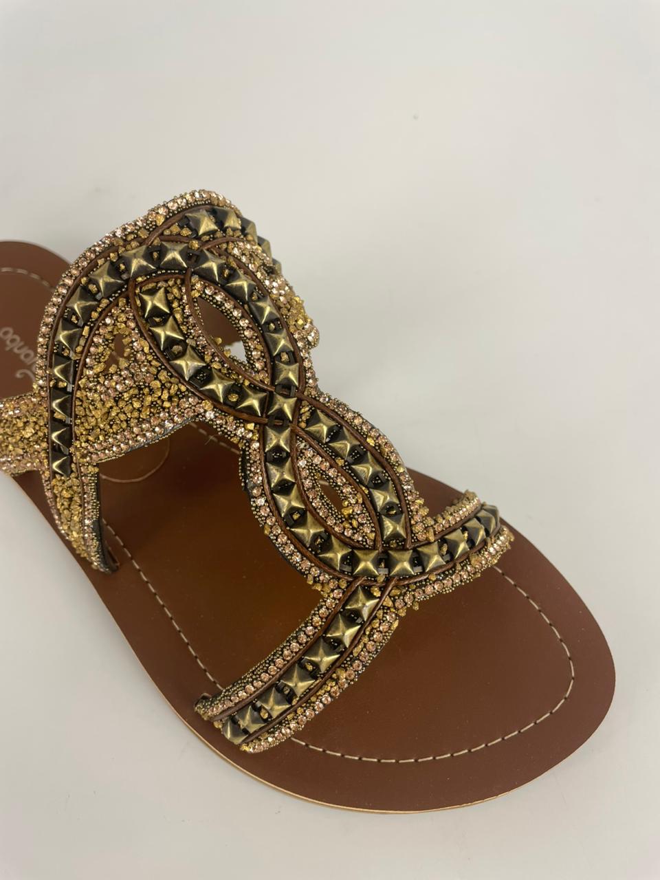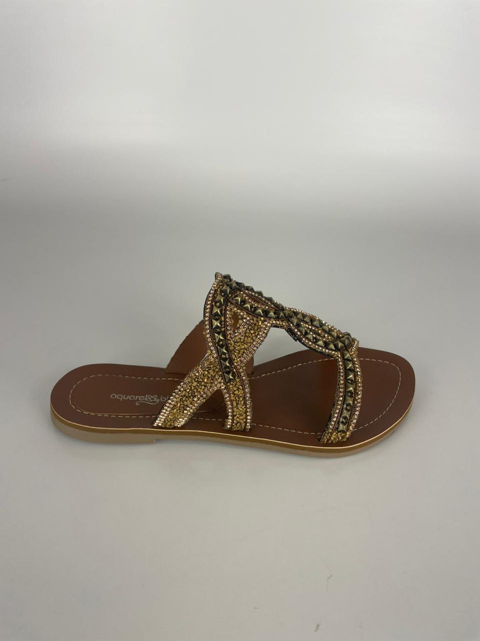 A Rasteira Ale é aquela peça que transforma o look com zero esforço. O destaque fica por conta das aplicações metalizadas e pedrarias, formando um desenho elegante que valoriza o pé e traz aquela luminosidade perfeita para o verão.