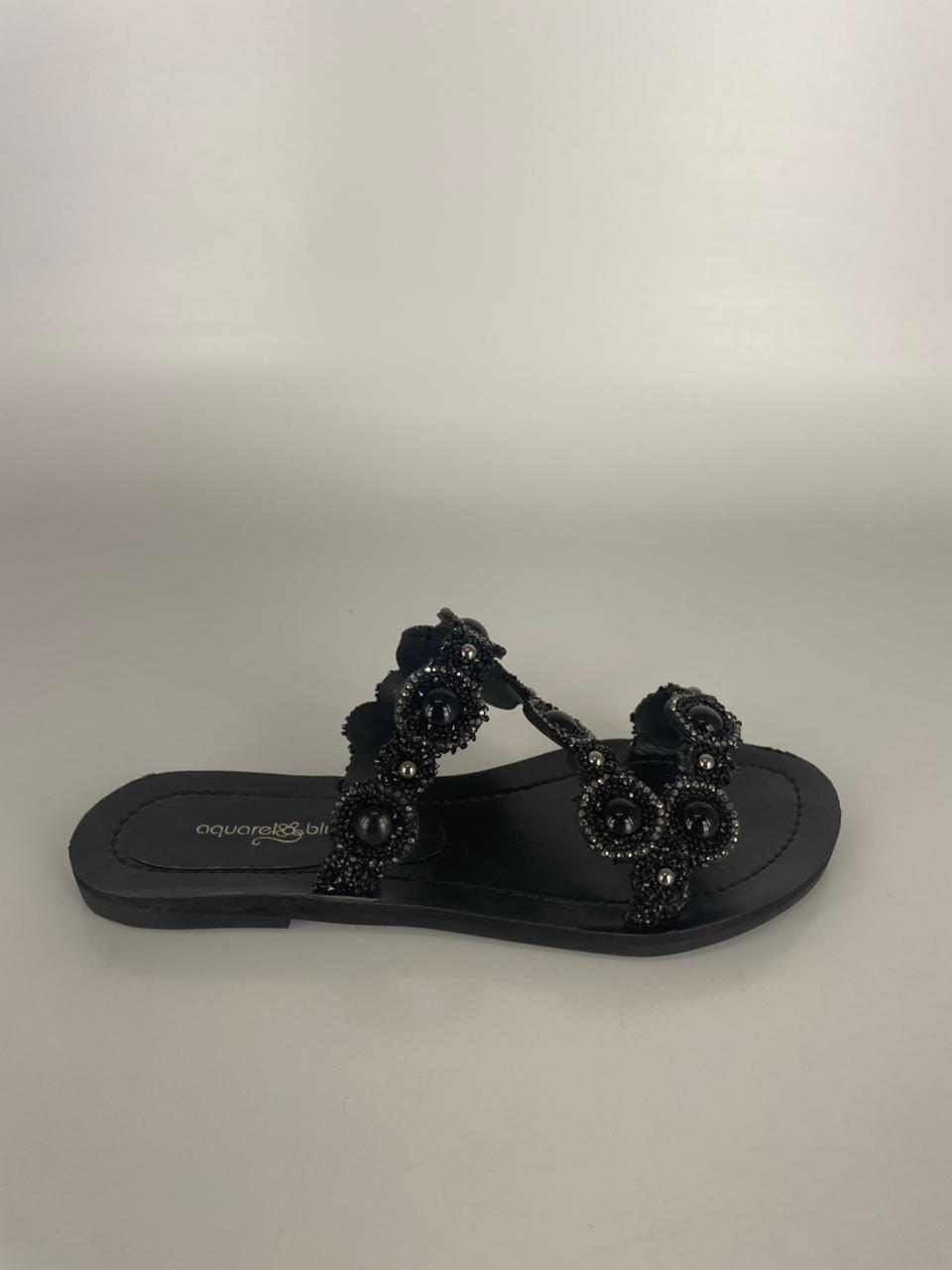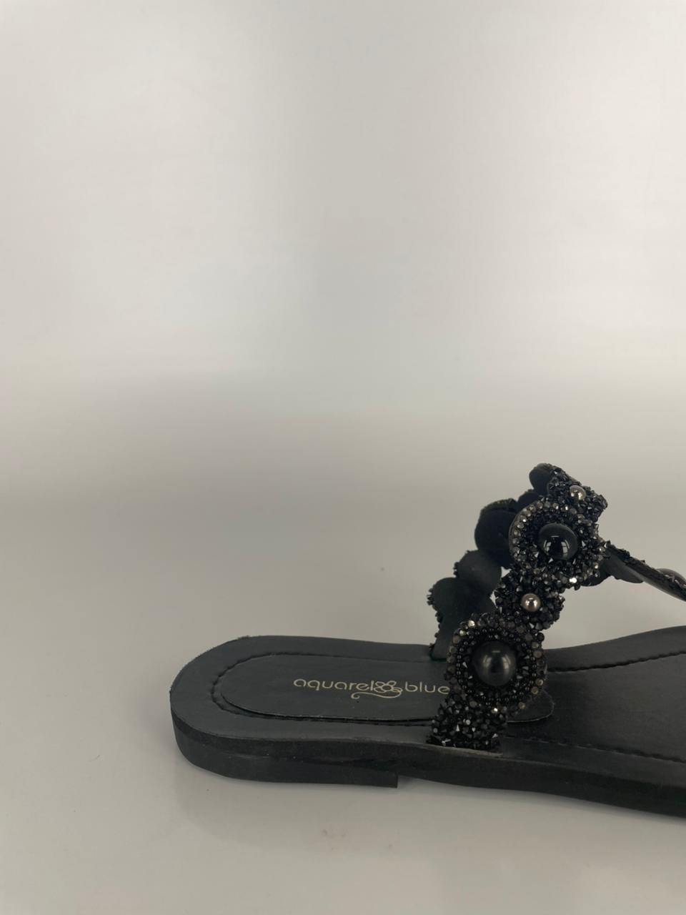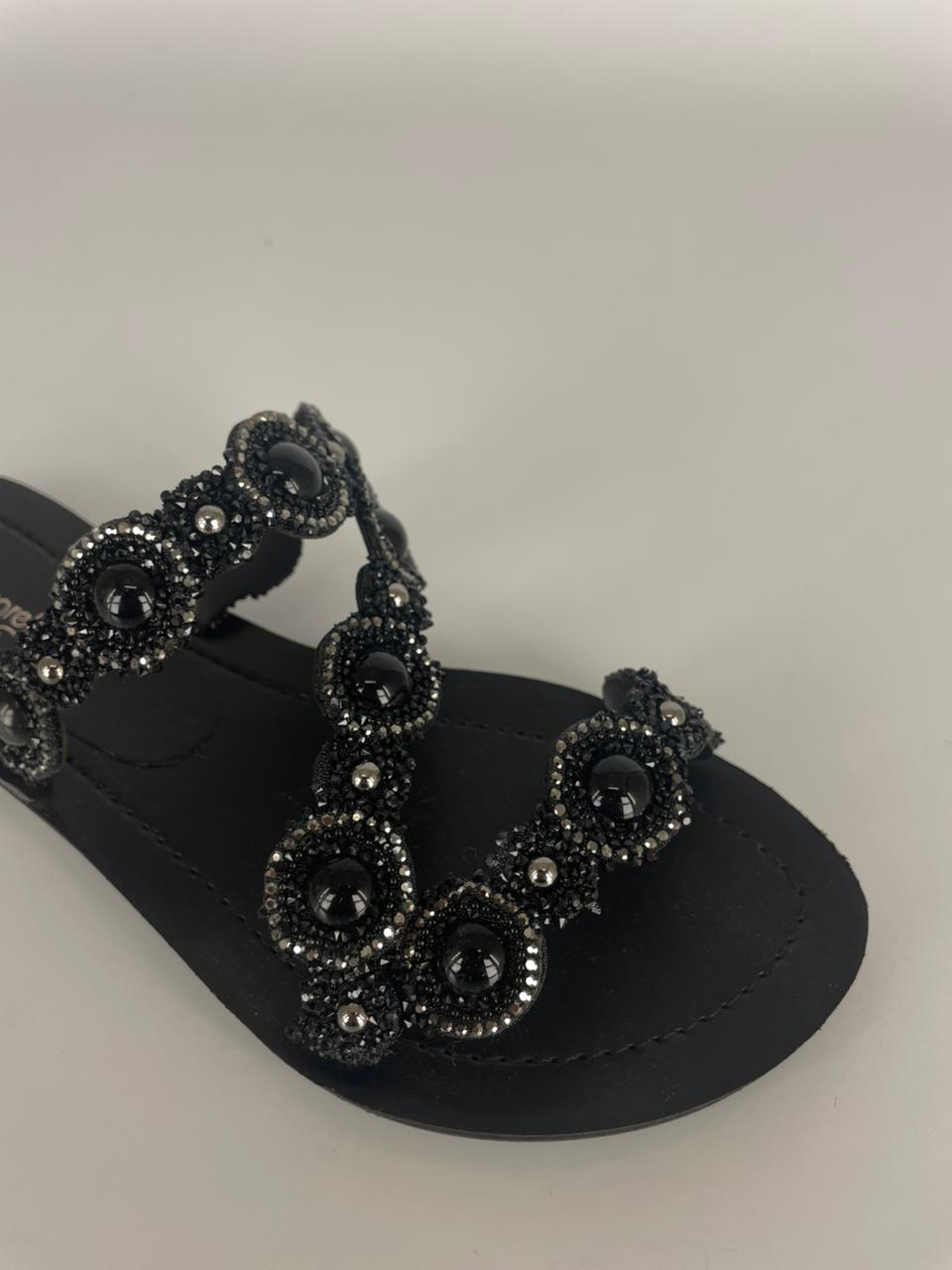 A Marisa é aquela rasteira que transforma qualquer look! Com tiras trabalhadas em pedrarias pretas e microaplicações brilhantes, ela traz um visual sofisticado e poderoso sem perder o conforto.