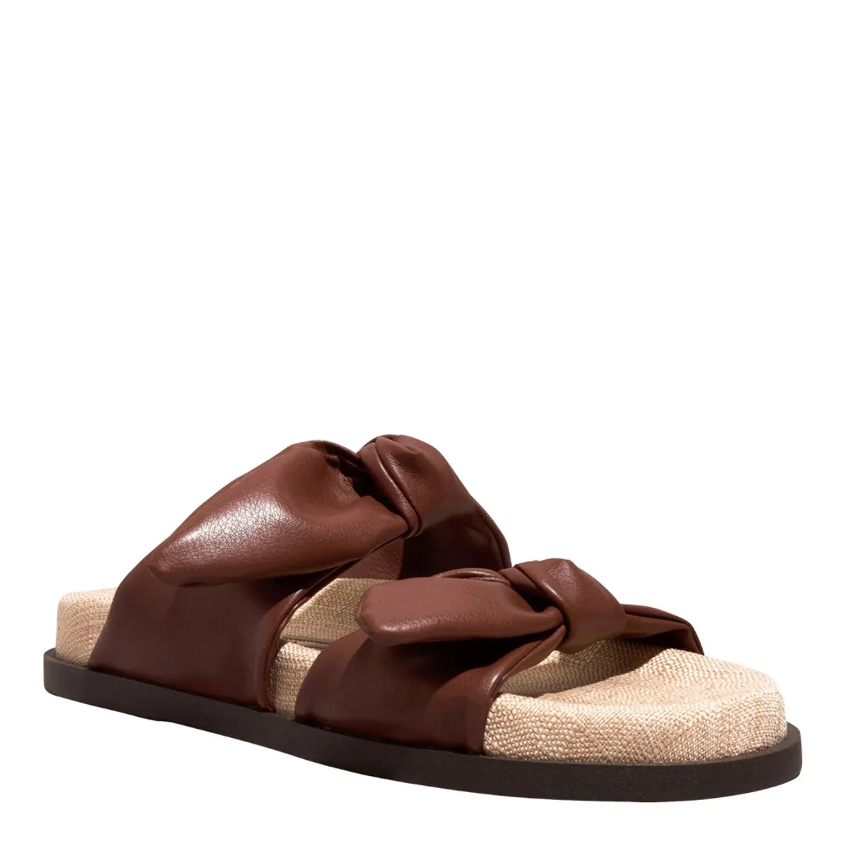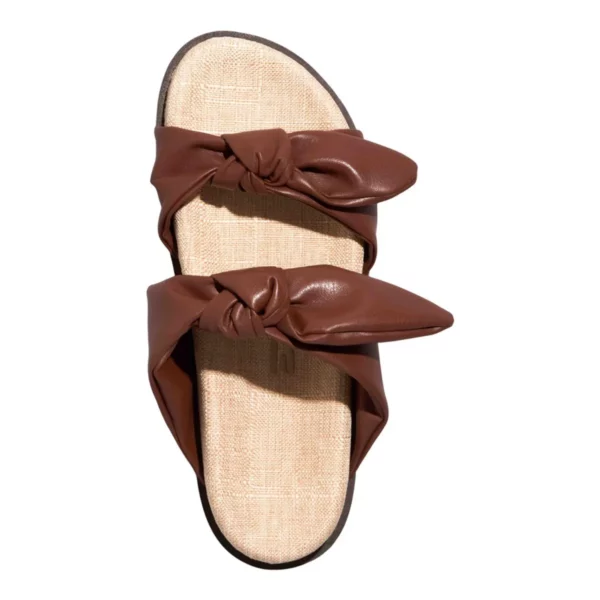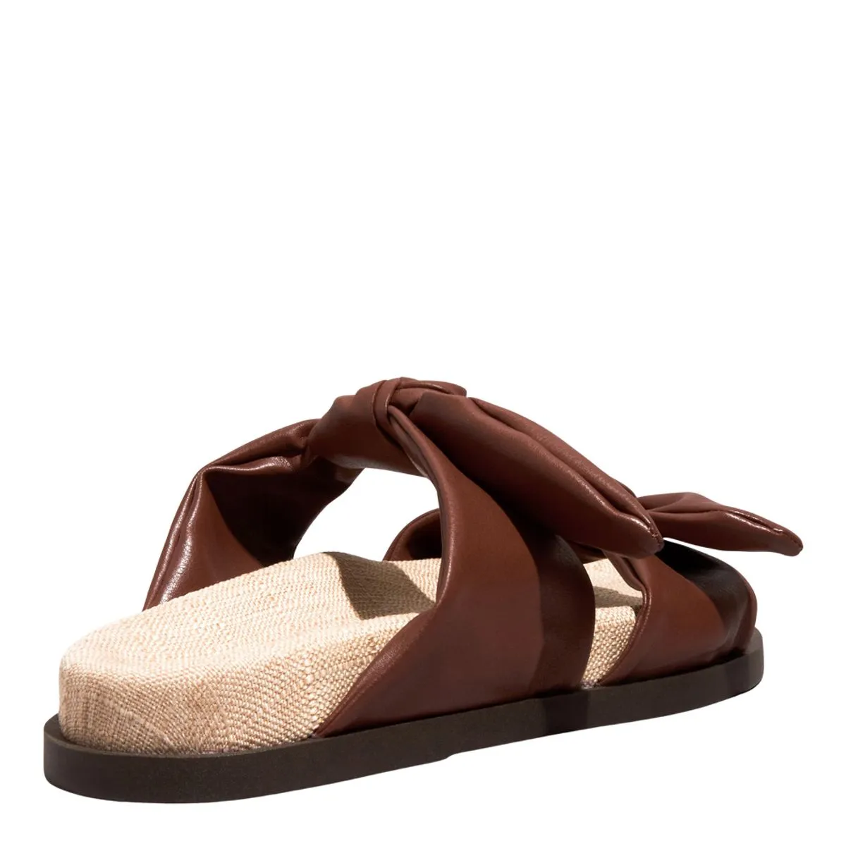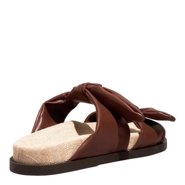 Papete feminina confeccionada em napa soft, com solado flat de acabamento em linho e bico redondo. O modelo conta com tiras delicadas em nó, que adicionam charme e estilo ao visual, ideal para composições casuais com um toque moderno.