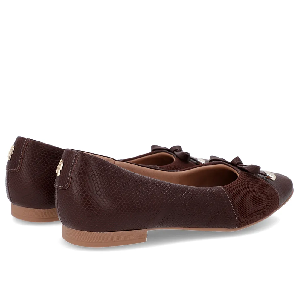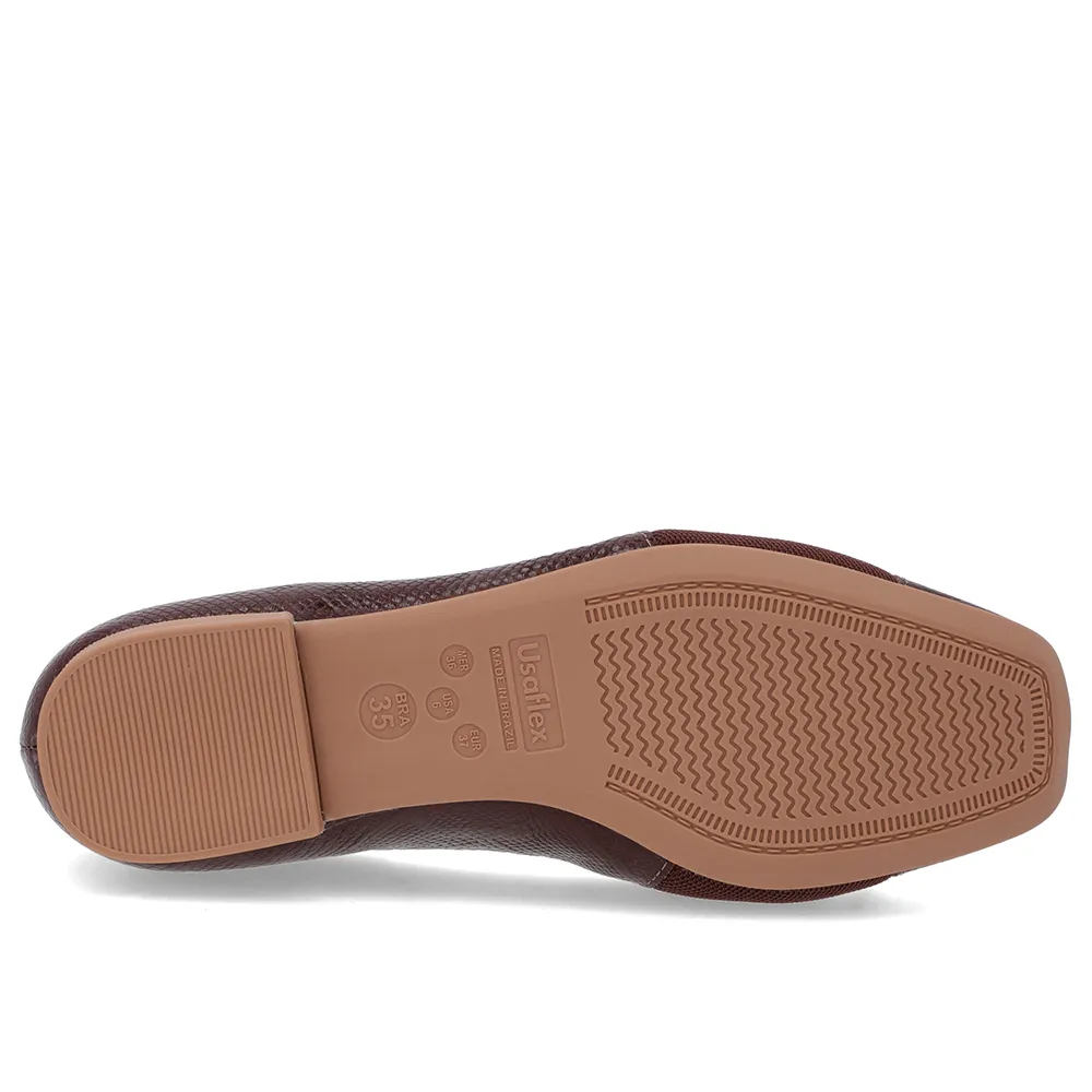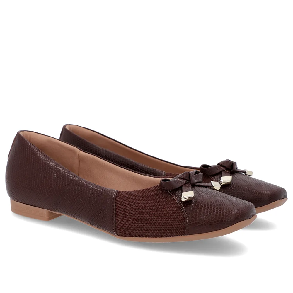 Sapatilha cabedal em couro snake anilina na cor pinhão. O modelo possui tecnologia Joanetes, que alivia o desconforto da região, garantindo suavidade na pisada por usufruir de materiais moldáveis nos pés.
