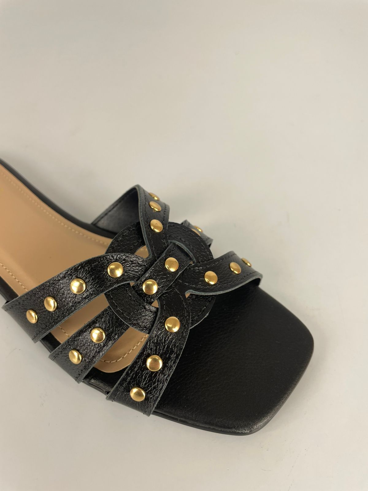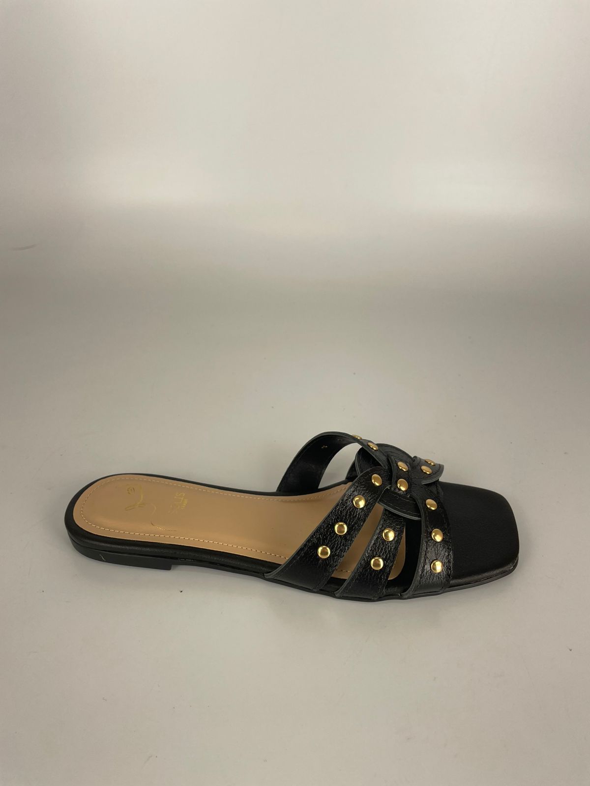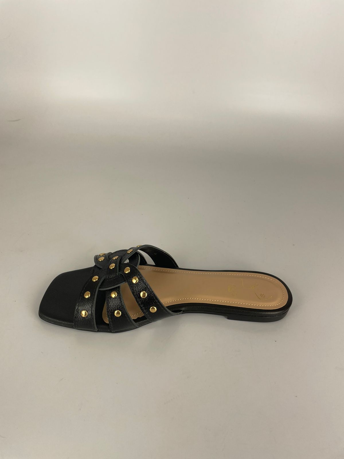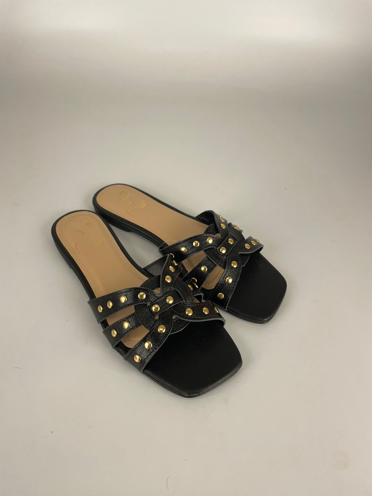 O chinelo SOLIS é a escolha ideal para quem busca estilo com praticidade no dia a dia. Com design moderno e marcante, ele traz tiras largas em couro de alta qualidade, adornadas com tachas douradas que elevam o visual e garantem um toque de sofisticação.