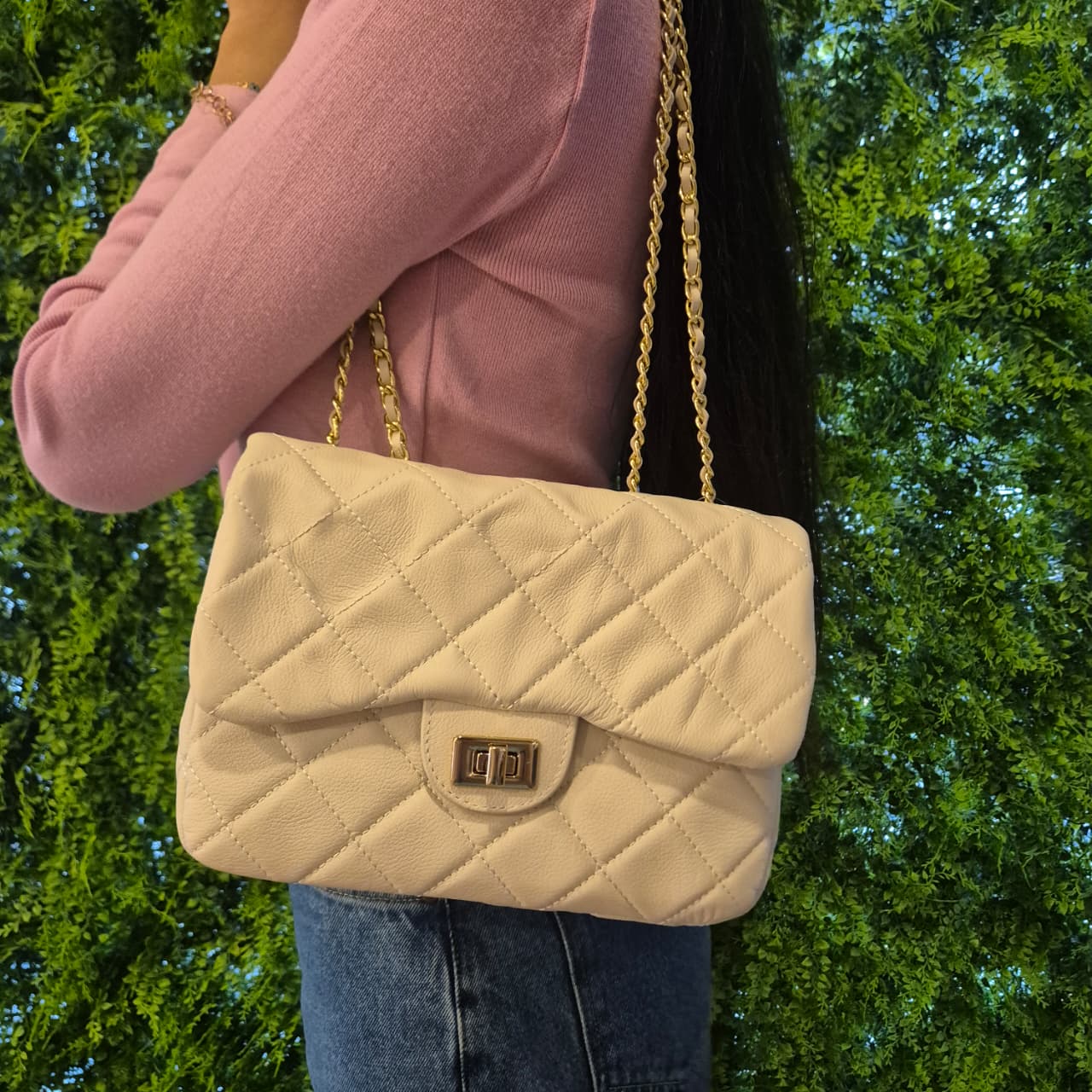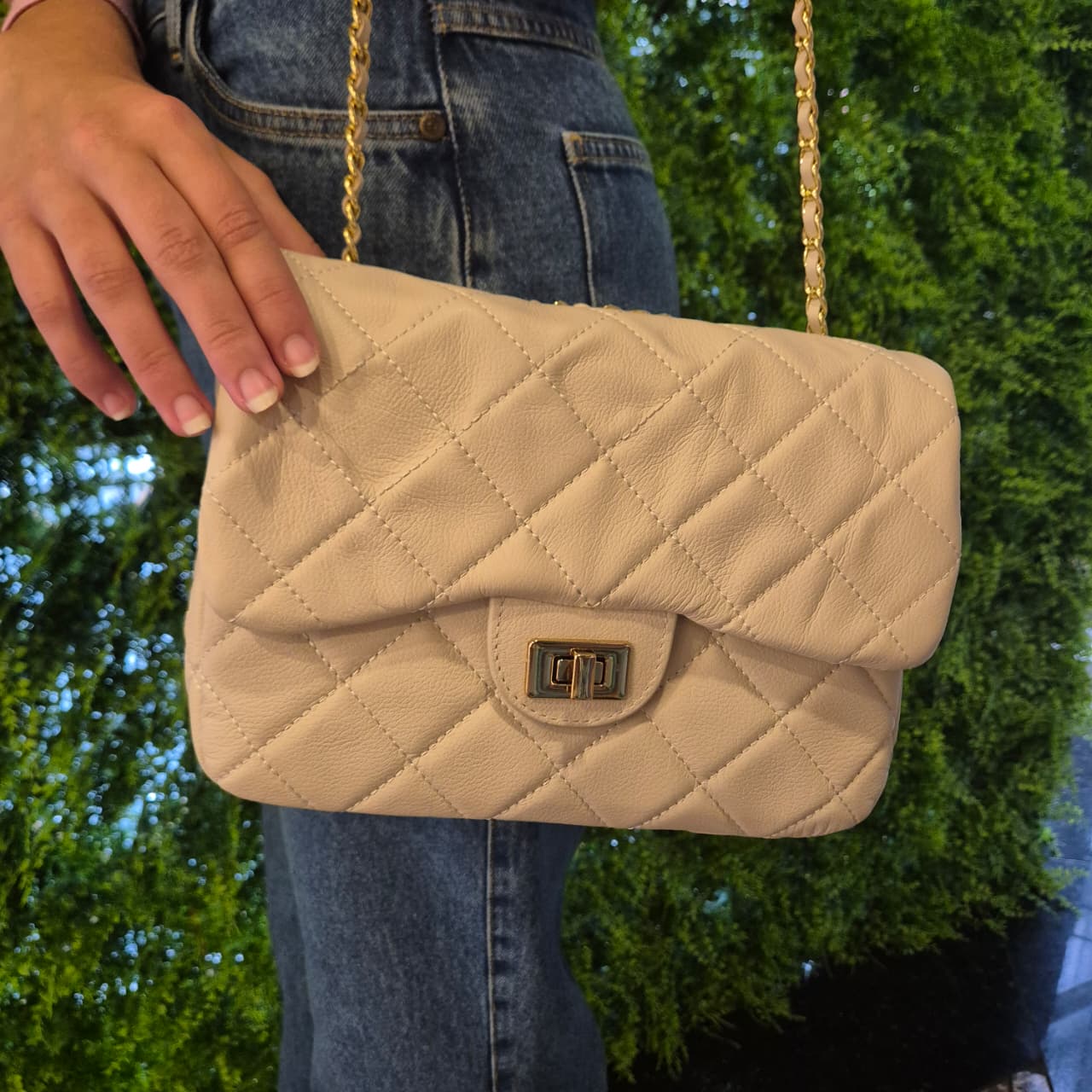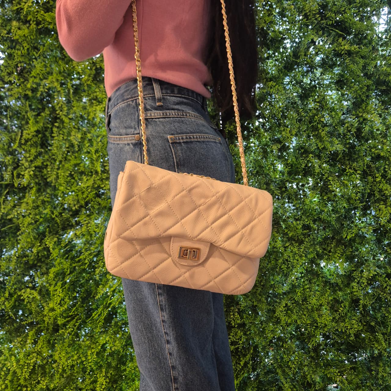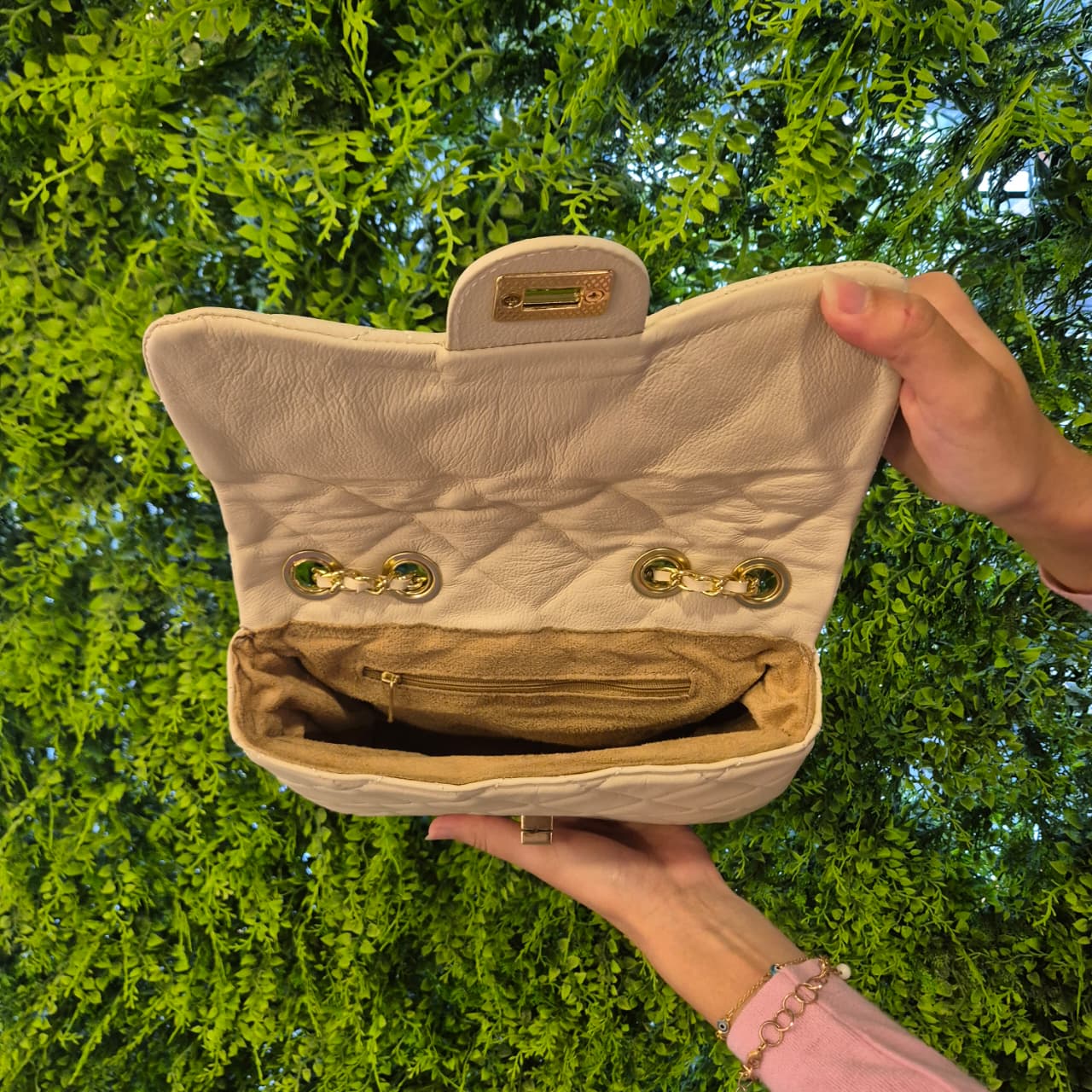 O matelassê delicado, o fecho metálico dourado e a alça em corrente trazem sofisticação e charme na medida certa.Compacta e funcional, é perfeita para elevar produções do dia a dia ou completar looks noturnos com um toque de luxo discreto.