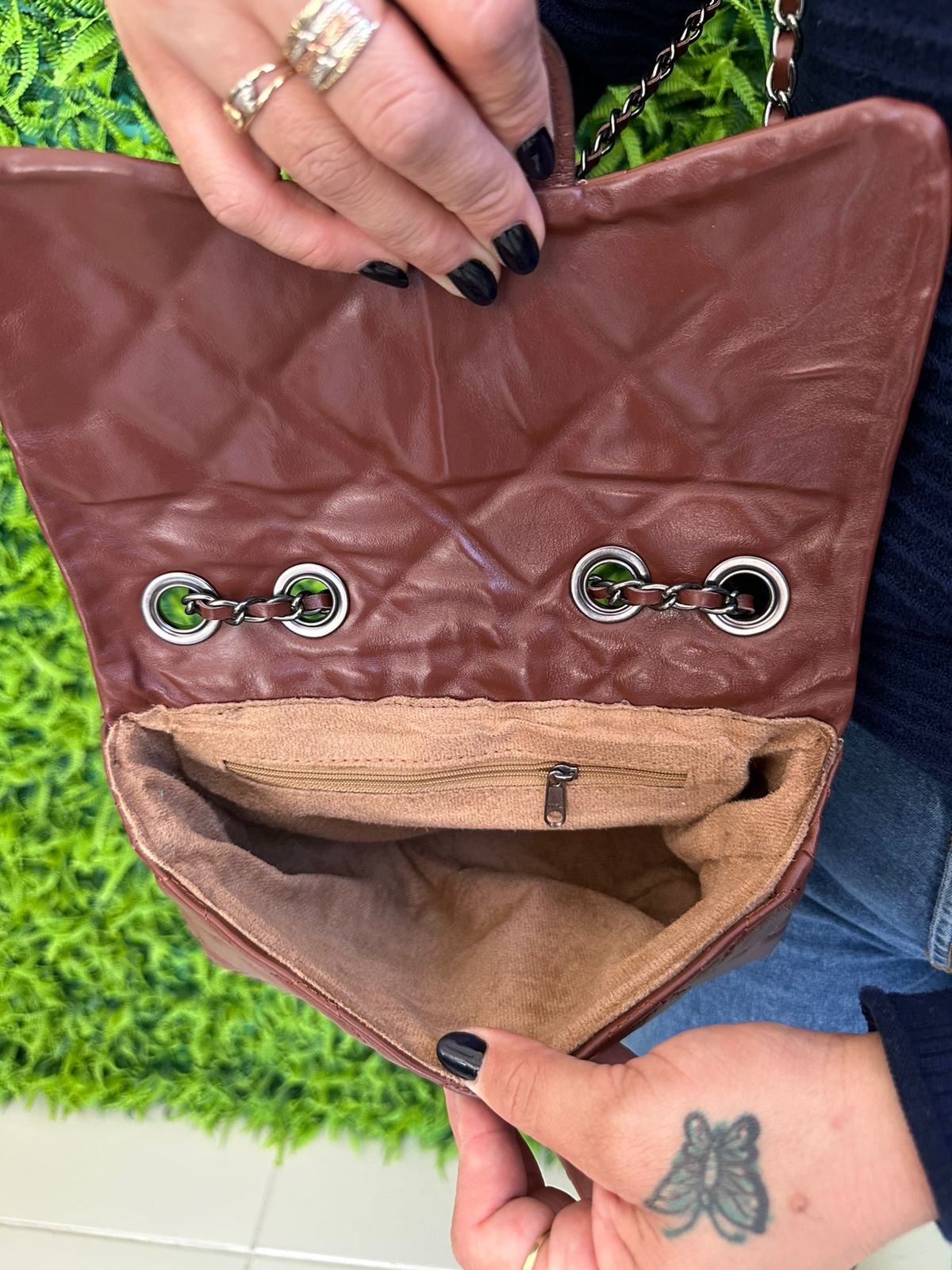 O matelassê delicado, o fecho metálico dourado e a alça em corrente trazem sofisticação e charme na medida certa.Compacta e funcional, é perfeita para elevar produções do dia a dia ou completar looks noturnos com um toque de luxo discreto.