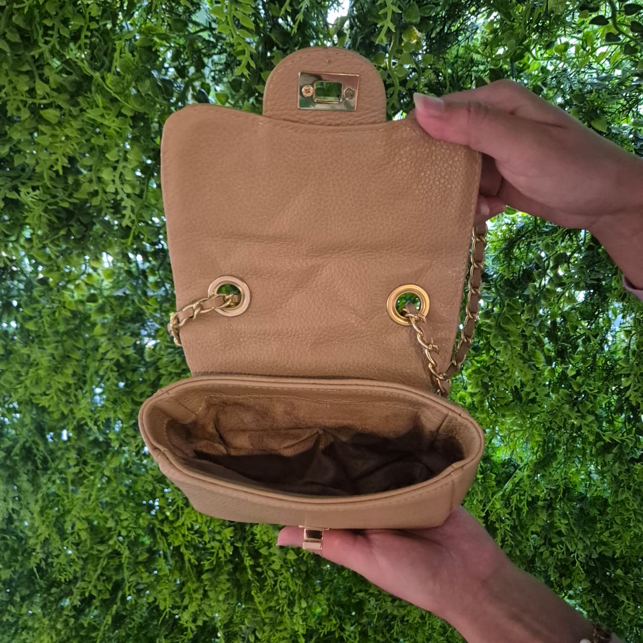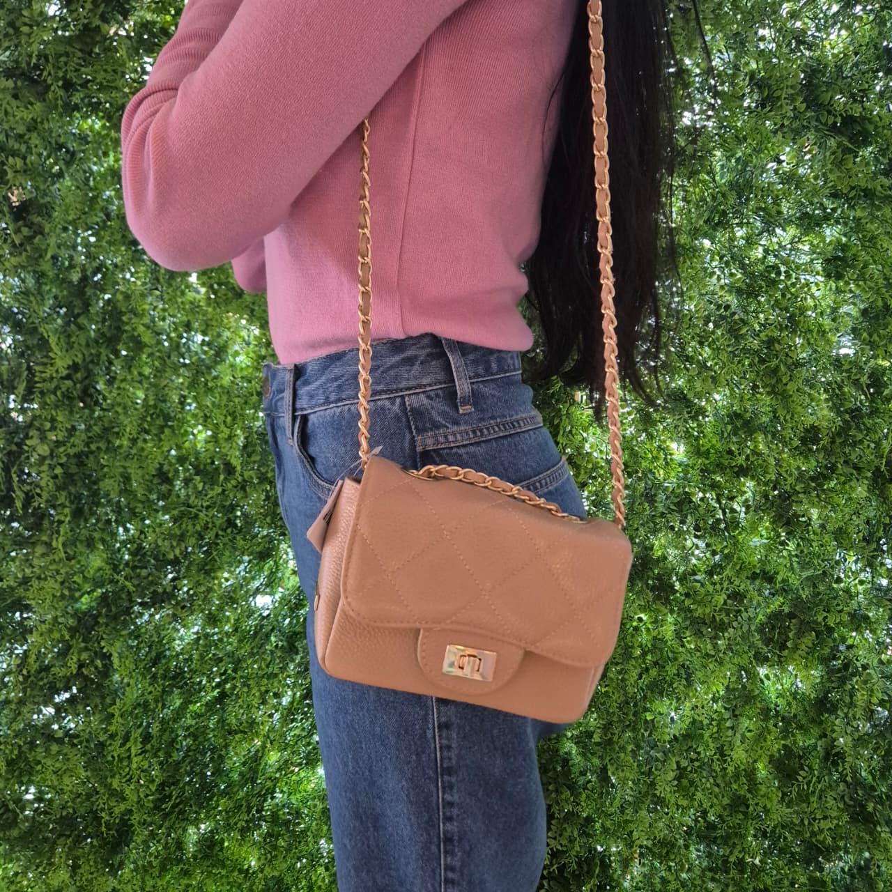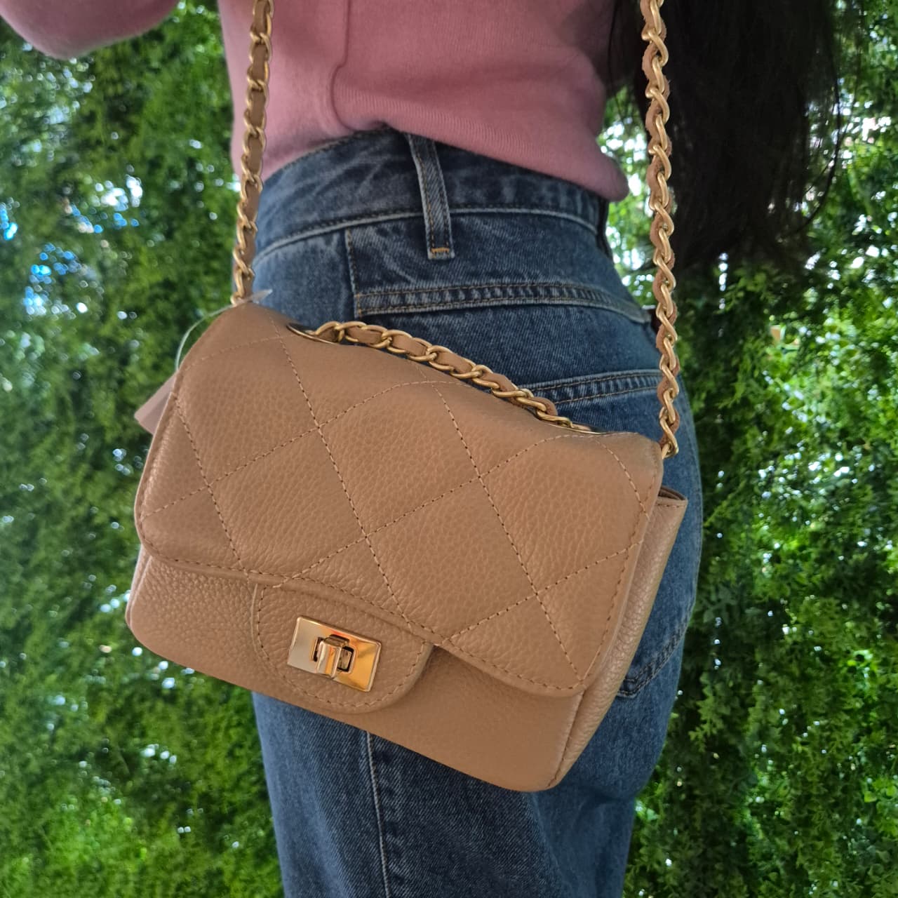 O matelassê delicado, o fecho metálico dourado e a alça em corrente trazem sofisticação e charme na medida certa.Compacta e funcional, é perfeita para elevar produções do dia a dia ou completar looks noturnos com um toque de luxo discreto.