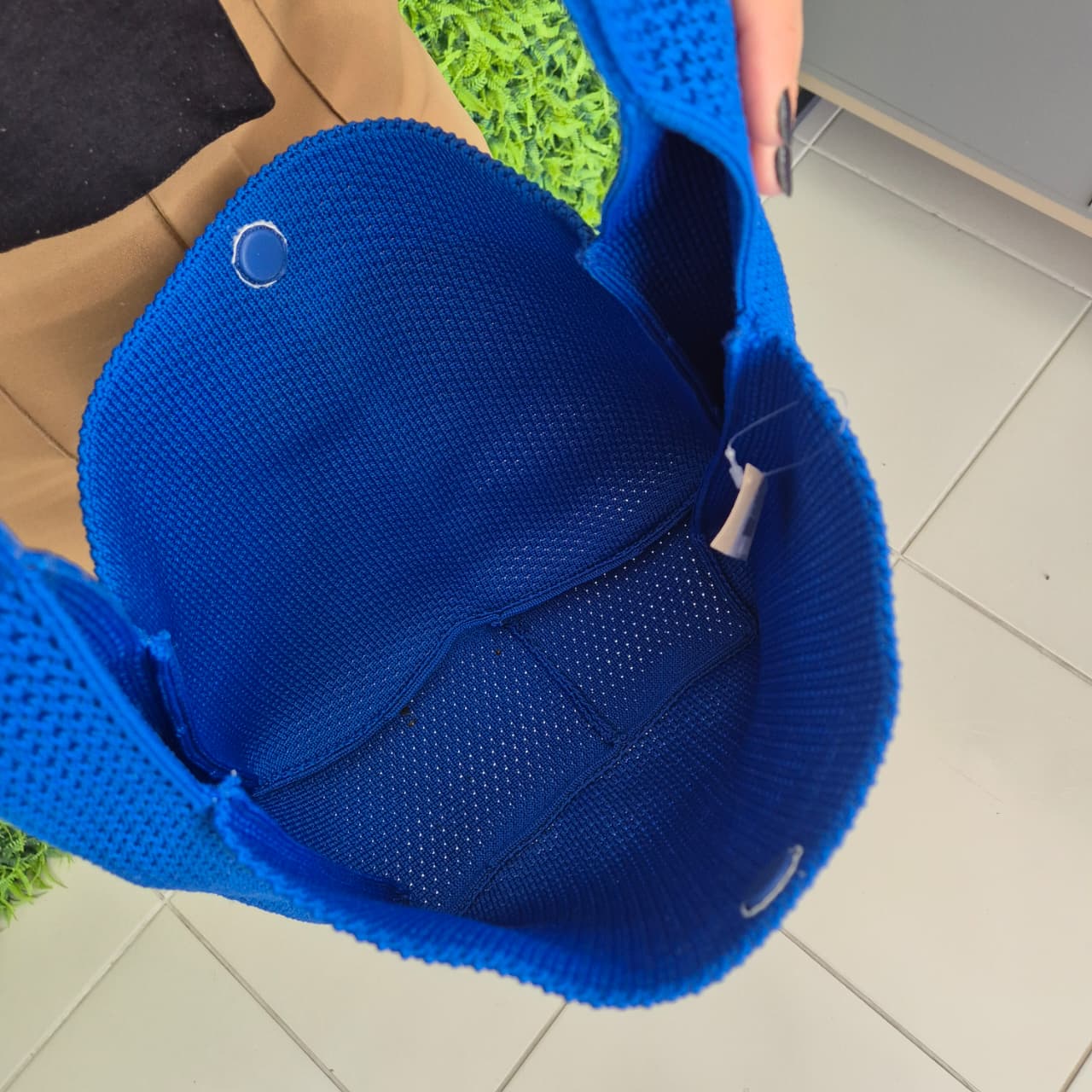 Bolsa knit grande azul bic, confeccionada em malha tricotada de toque macio e estrutura flexível. O modelo possui fechamento por botão magnético, alça larga para ombro e amplo espaço interno, ideal para o dia a dia.
