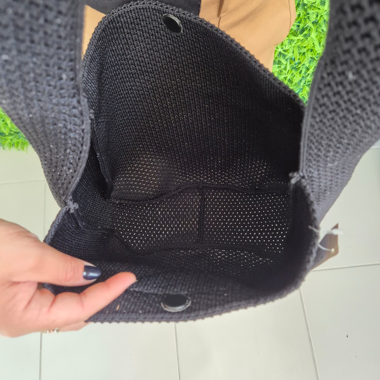 Bolsa knit grande preta, confeccionada em malha tricotada de toque macio e estrutura flexível. O modelo possui fechamento por botão magnético, alça larga para ombro e amplo espaço interno, ideal para o dia a dia.