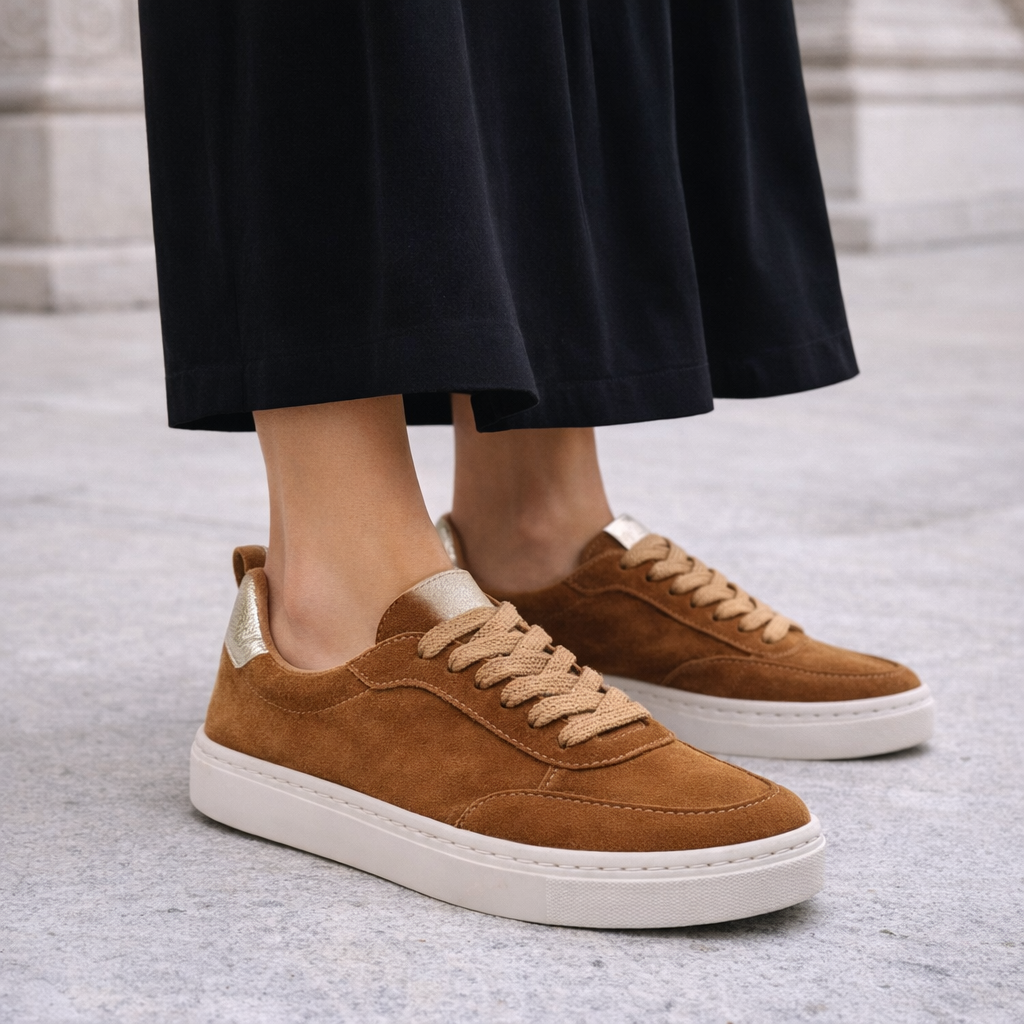 Transforme seu visual com o Tênis Sneaker em Camurça. Combinando a textura rica da camurça caramelo com a atitude moderna de um solado flatform, este tênis é a definição do estilo effortless chic. É a escolha perfeita para quem busca conforto sem abrir mão de um toque de sofisticação em suas produções casuais.