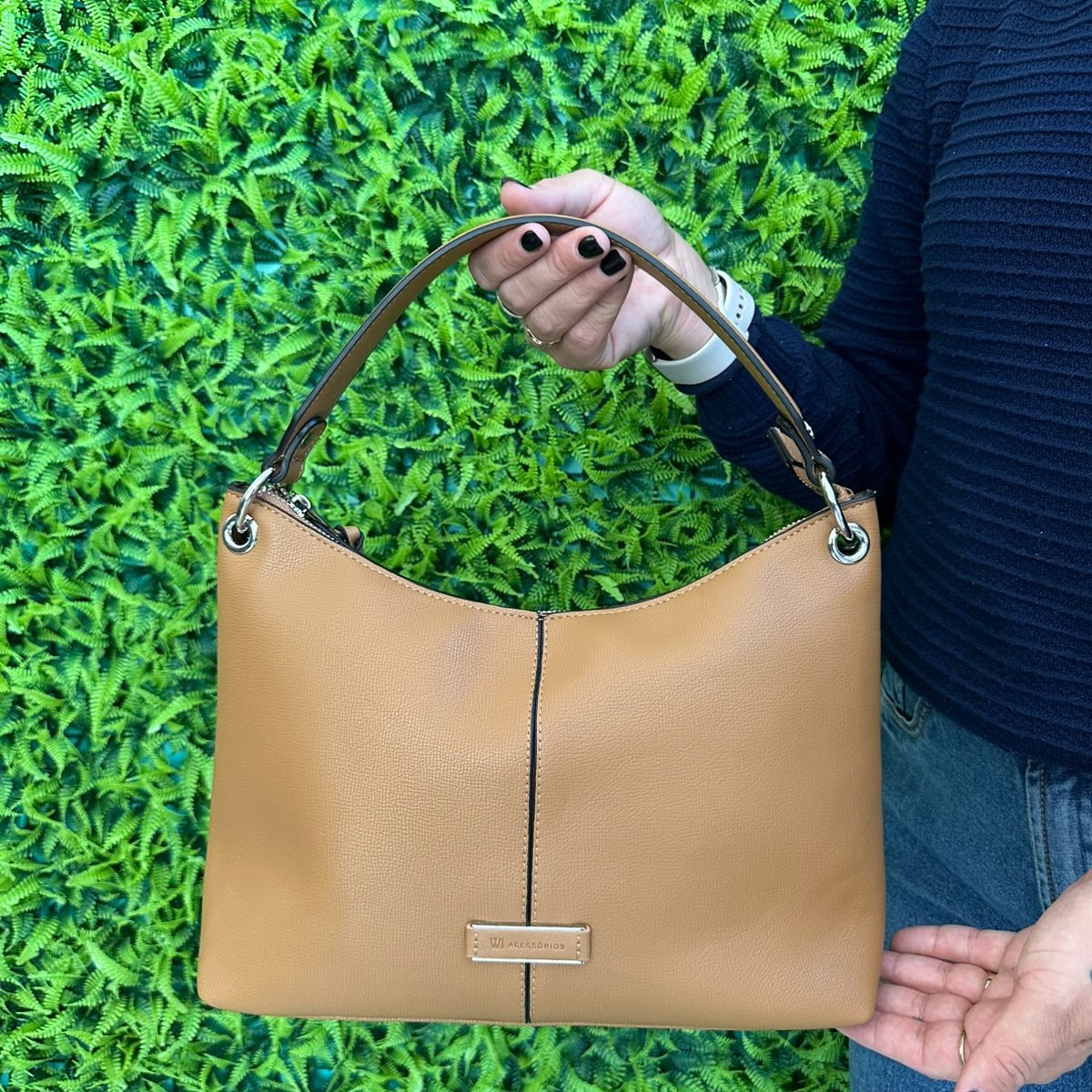 Bolsa WJ Acessórios em tom caramelo clássico, confeccionada em material sintético de textura leve e toque macio.