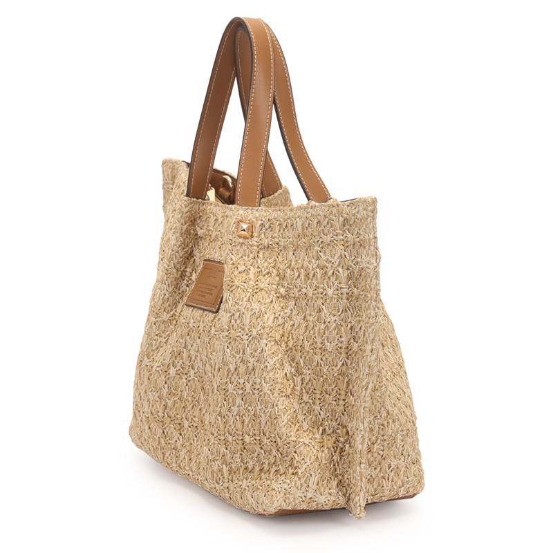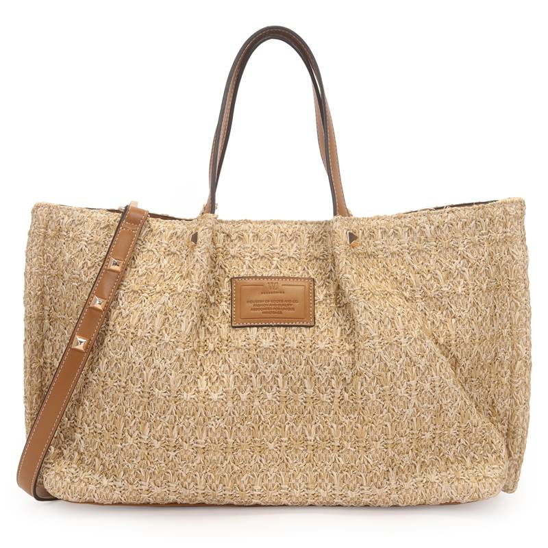 A Bolsa Satchel Grande em palha com detalhes de metais pirâmides une elegância natural e atitude. O contraste entre o trançado artesanal e o brilho metálico cria um visual moderno e sofisticado.