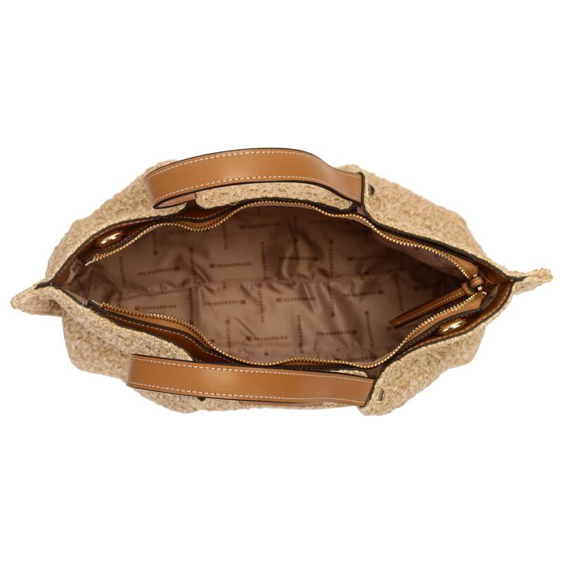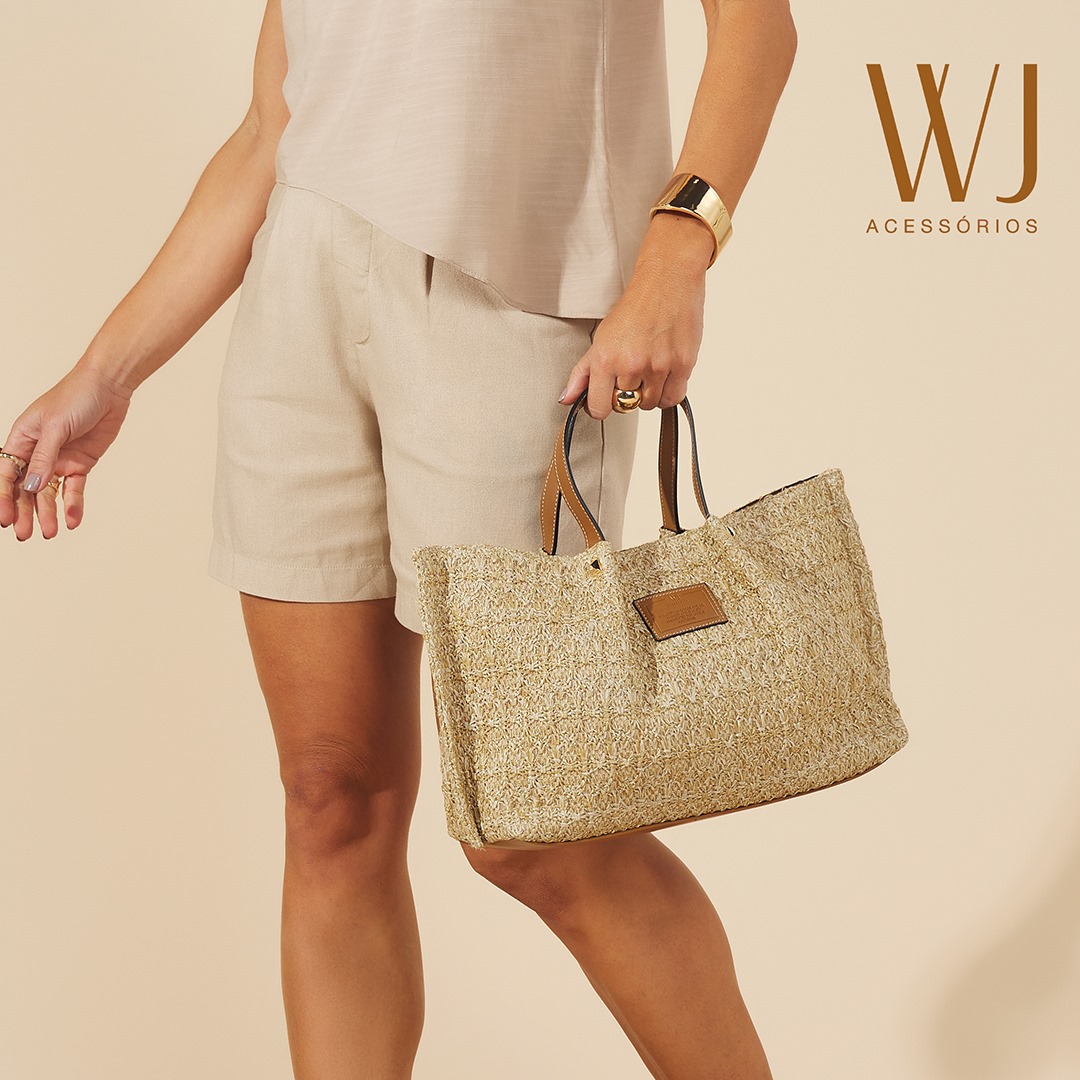 WJ Bolsa Satchel Grande Palha Detalhe Metais Piramides Cru