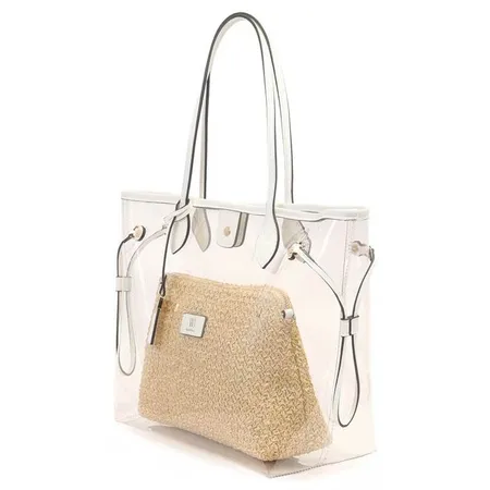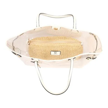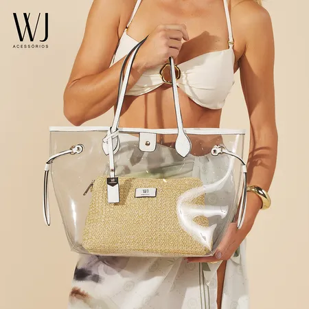 A shopping bag grande em plástico com nécessaire de palha une resistência e estilo natural. Espaçosa e prática, é perfeita para organizar seus itens com charme, trazendo um toque artesanal e moderno para o dia a dia.