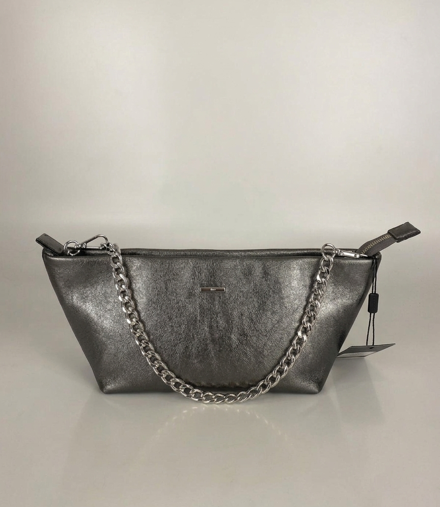 Esta sofisticada bolsa feminina é projetada para adicionar um toque de brilho moderno e elegância a qualquer visual. Com o seu formato trapezoidal único e um acabamento prateado metálico texturizado, esta peça é perfeita tanto para eventos noturnos formais quanto para um toque de glamour casual durante o dia. A bolsa apresenta uma alça de corrente de metal prateado polido que se curva graciosamente ao longo da frente, permitindo que seja usada no ombro ou como uma bolsa transversal transversal.