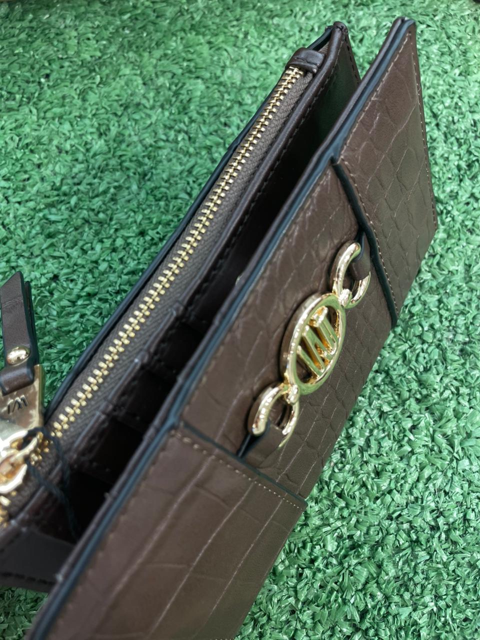 Confeccionada em material com textura croco e acabamento impecável, ela traz o logo metálico dourado da marca como destaque, unindo modernidade e luxo em uma única peça.