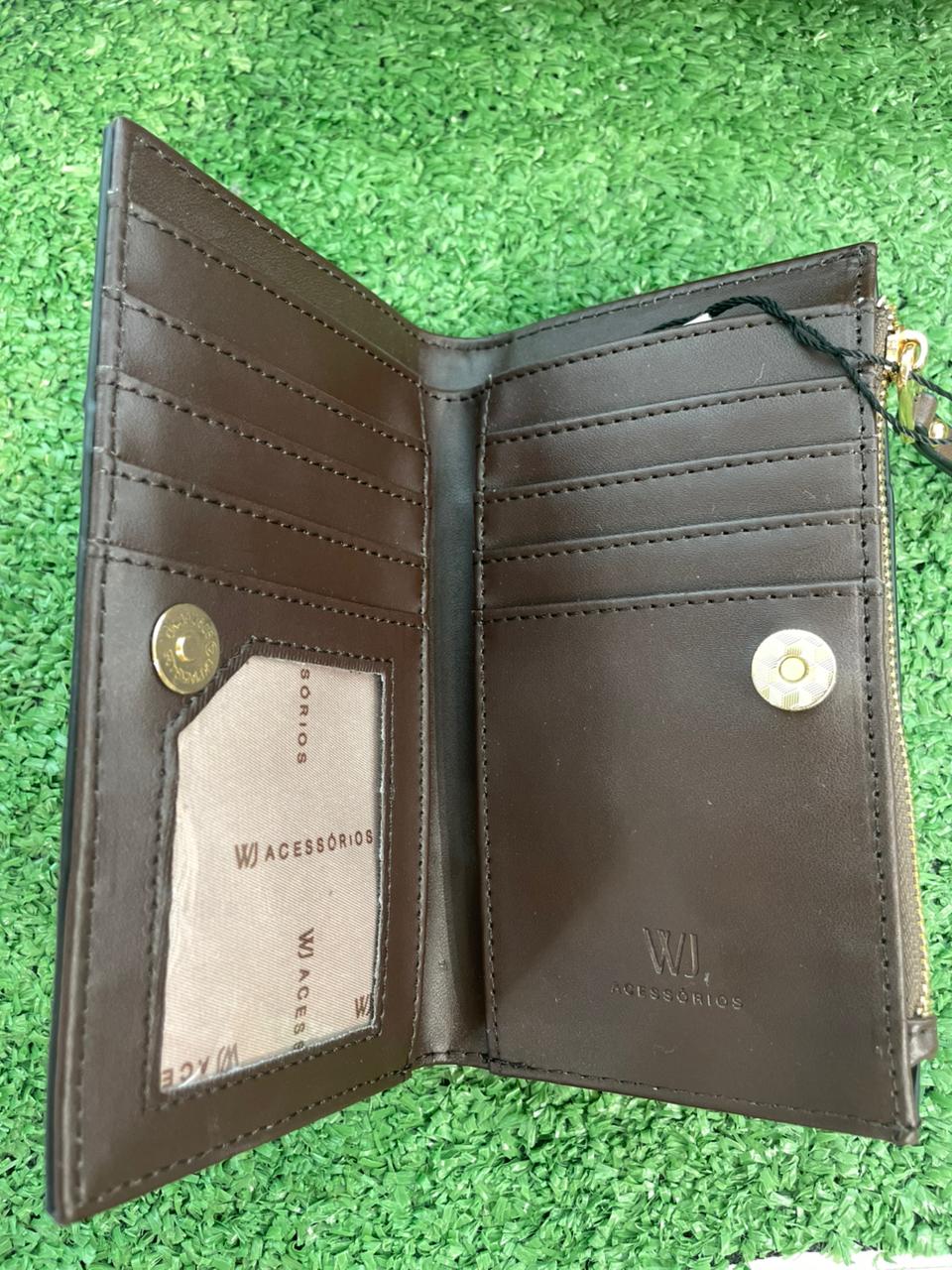 Com fechamento em botão e zíper, oferece múltiplos compartimentos internos para cartões, documentos e moedas — tudo com organização e segurança.