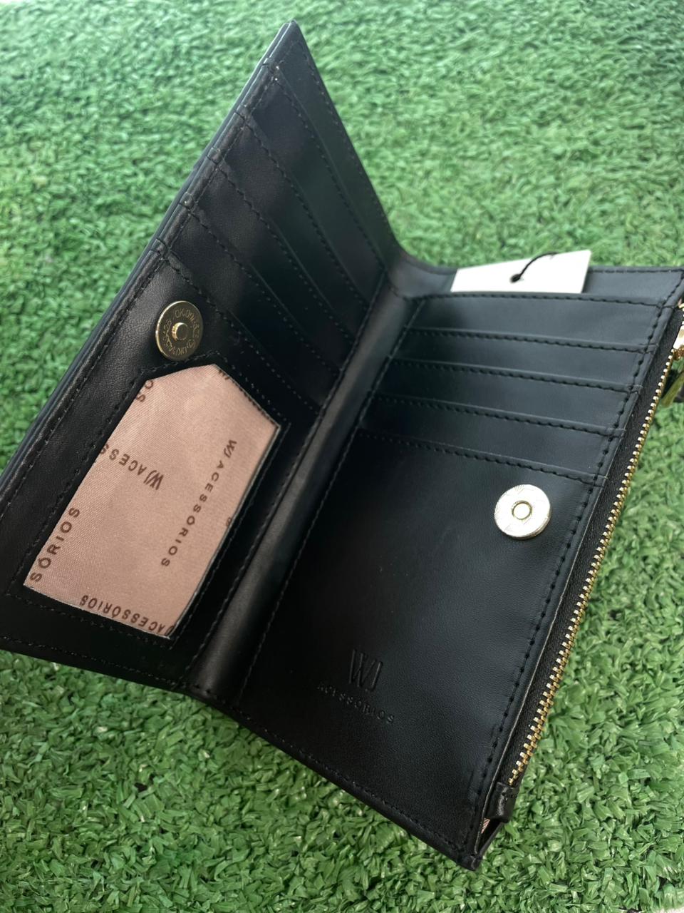 Com fechamento em botão e zíper, oferece múltiplos compartimentos internos para cartões, documentos e moedas — tudo com organização e segurança.