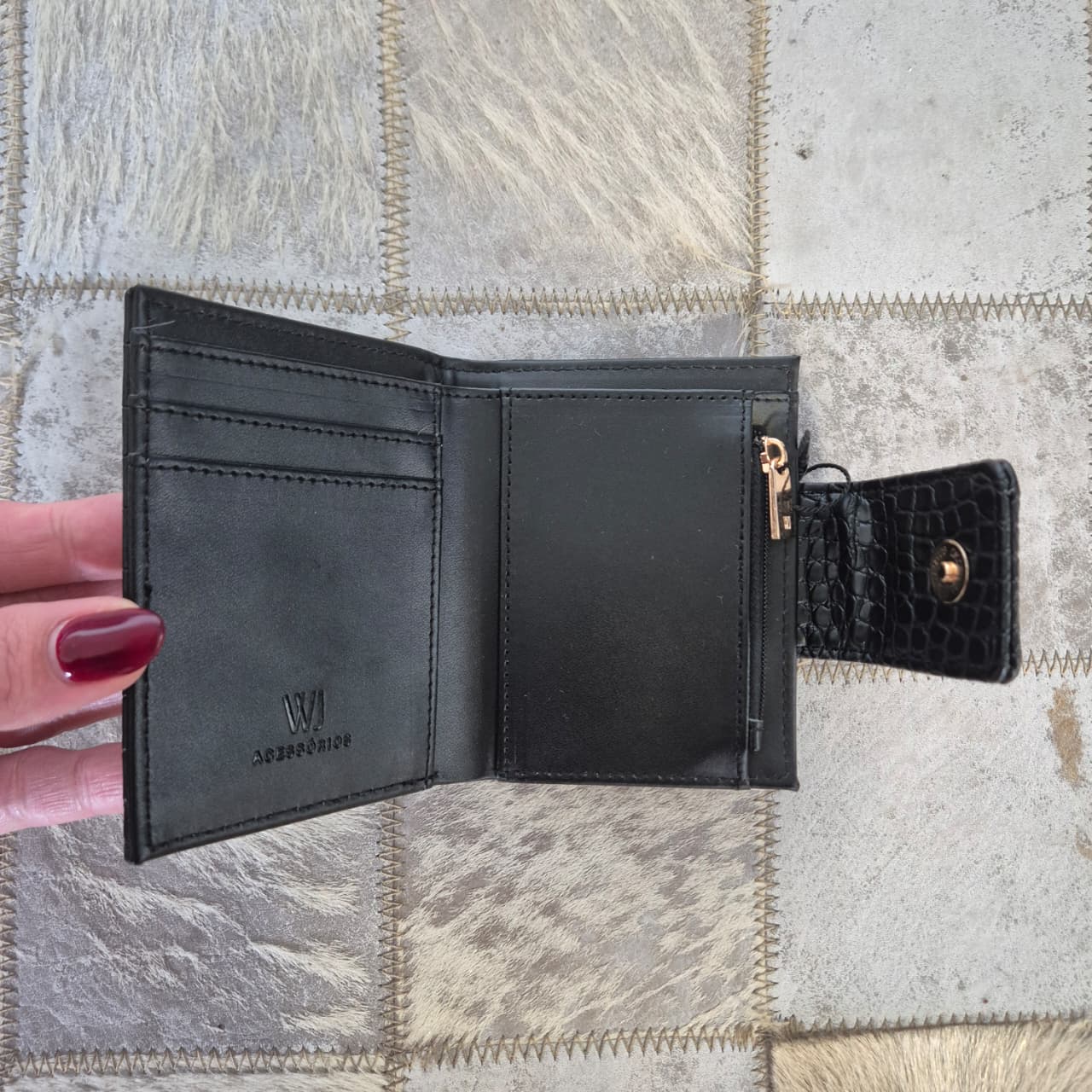 Confeccionada em material com textura croco preto, ela une sofisticação e praticidade no dia a dia. O fecho com detalhe em metal dourado traz um toque elegante e moderno, enquanto o interior é bem distribuído — com espaço para cartões, cédulas e moedas (com zíper interno).