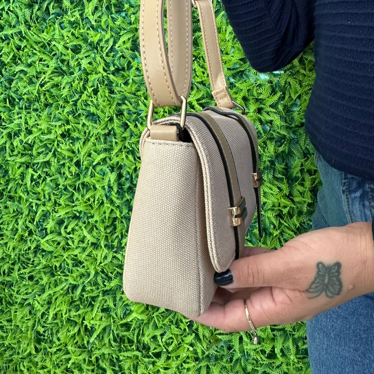 Com estrutura firme, fechamento por tampa com detalhe em fivelas douradas e alça ajustável, ela une praticidade e elegância em uma peça só. O toque macio e a textura emborrachada garantem resistência e um visual contemporâneo, ideal para compor produções leves e sofisticadas.