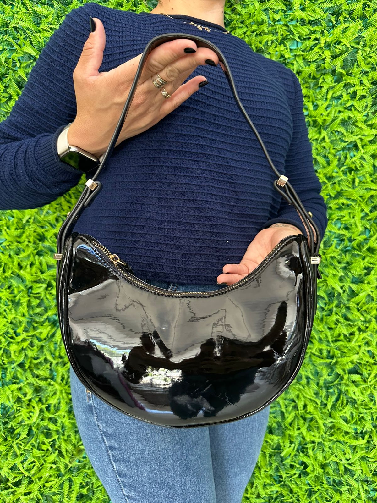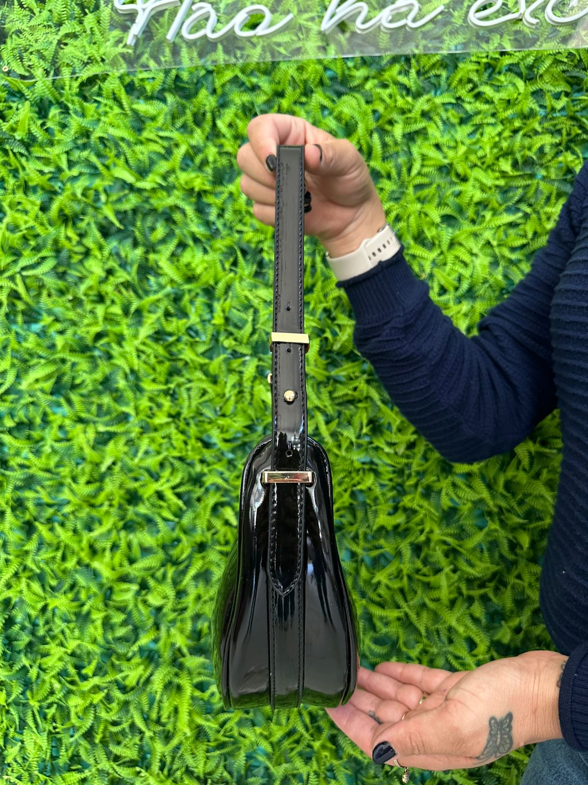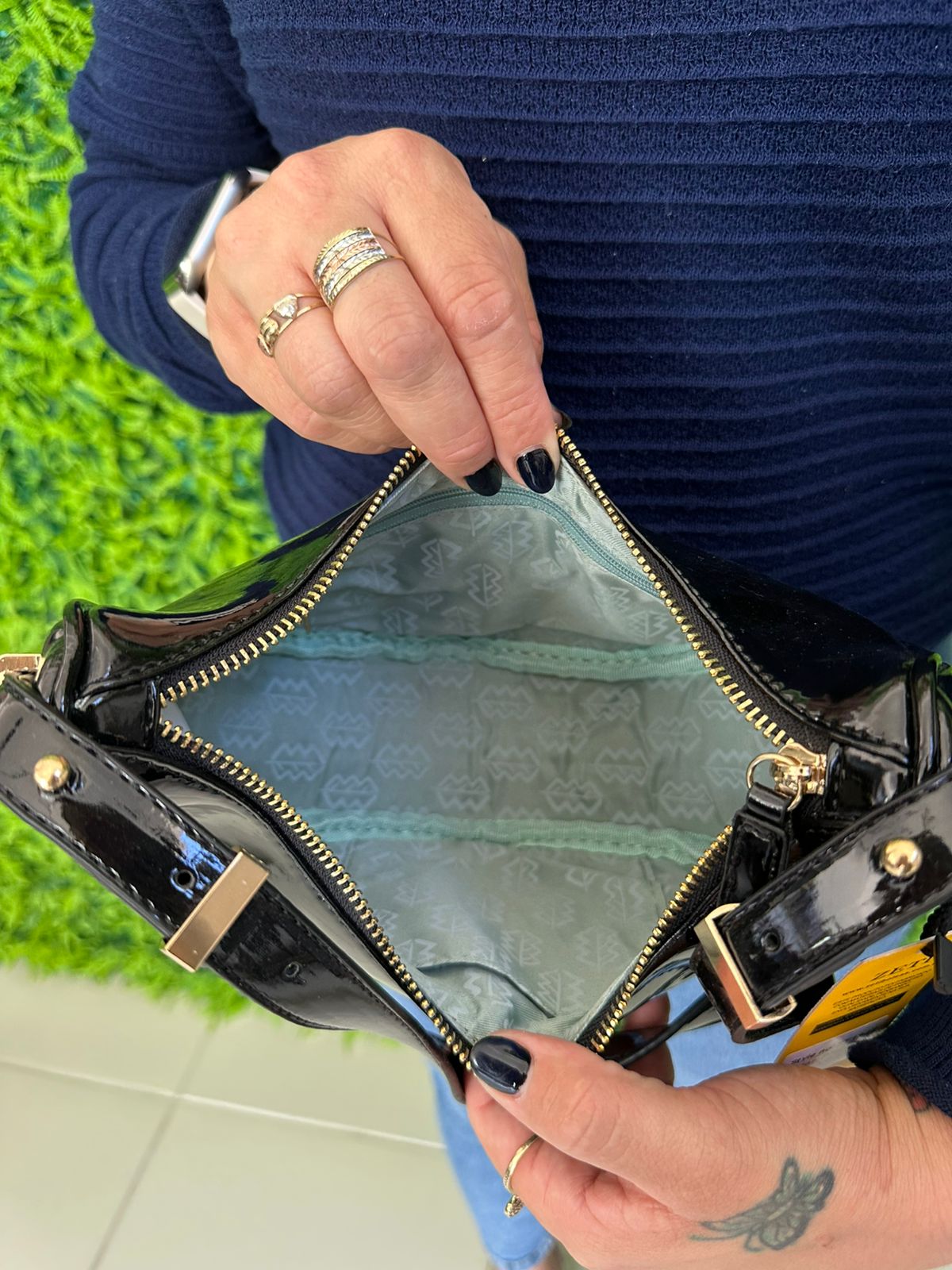 Bolsa Zeti em material sintético com acabamento verniz, trazendo aquele brilho elegante que transforma qualquer look.